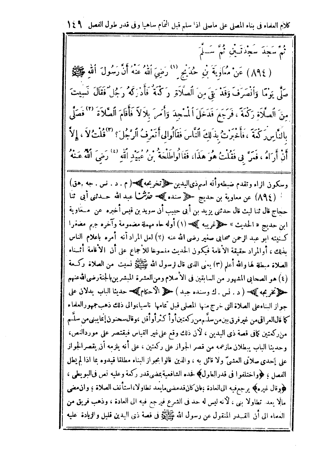 ثم سجد سجدتين ثم سلم. 894 - عن معاوية بن حديج (1) رضي الله عنه أن رسول الله صلى الله عليه وسلم صلى يومًا وانصرف وقد بقي من الصلاة ركعة فأدركه رجل فقال: نسيت من الصلاة ركعة، فرجع فدخل المسجد وأمر بلالاً فأقام الصلاة (2) فصلى بالناس ركعة، فأخبرت بذلك الناس فقالوا لي: أتعرف الرجل؟ (3) قلت: لا، إلا أن أراه، فمر بي فقلت: هو ذا. فقالوا: طلحة بن عبيد الله (4) رضي الله عنه