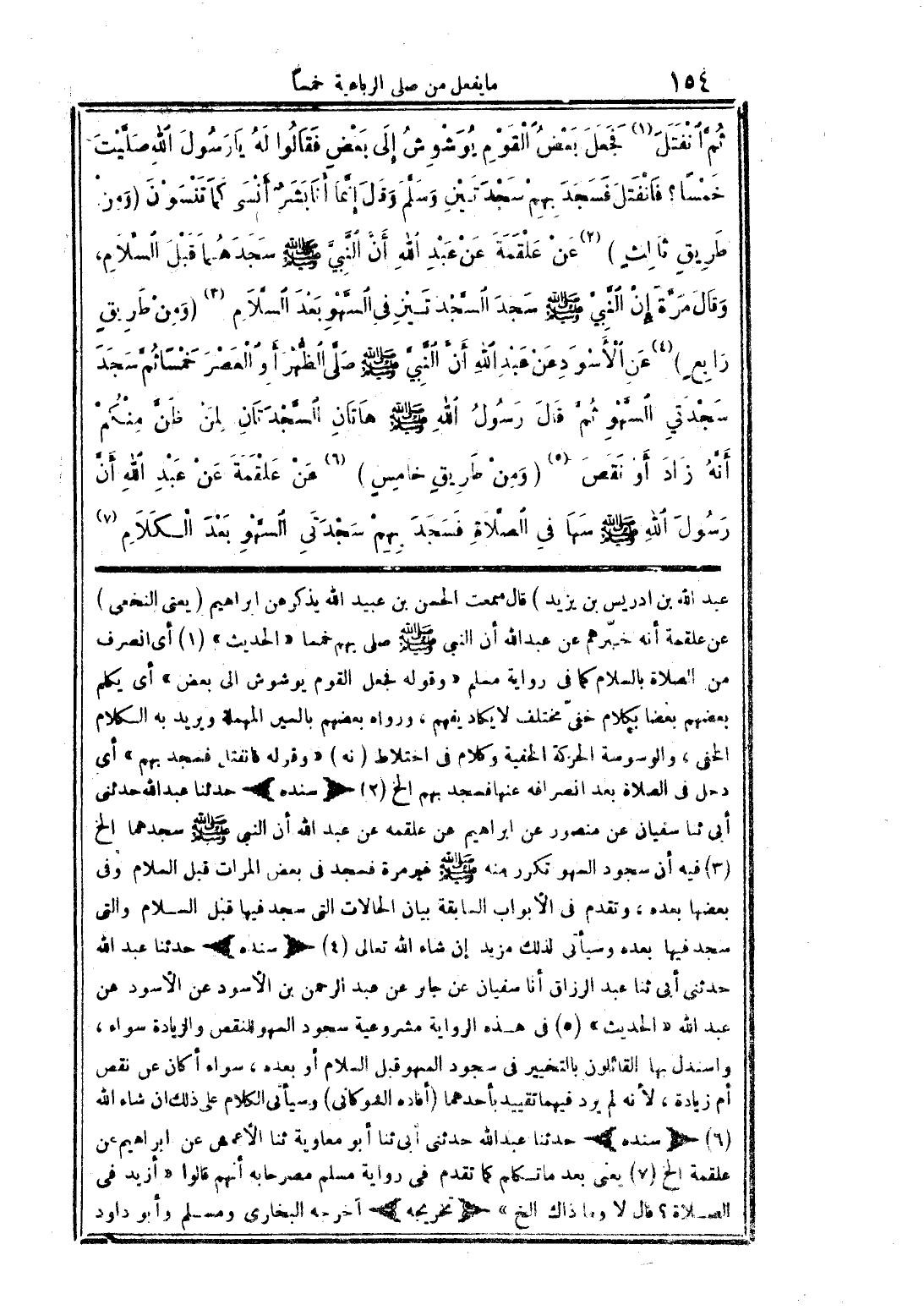 ثم انفتل (1) فجعل بعض القوم يوشوش إلى بعض فقالوا له: يا رسول الله صليت خمسًا؟ فانفتل فسجد بهم سجدتين وسلم وقال: إنما أنا بشر أنسى كما تنسون. ومن طريق ثالث (2) عن علقمة عن عبد الله أن النبي صلى الله عليه وسلم سجدهما قبل السلام، وقال مرة: إن النبي صلى الله عليه وسلم سجد السجدتين في السهو بعد السلام (3). ومن طريق رابع (4) عن الأسود عن عبد الله أن النبي صلى الله عليه وسلم صلى الظهر أو العصر خمسًا ثم سجد سجدتي السهو ثم قال رسول الله صلى الله عليه وسلم: هاتان السجدتان لمن ظن منكم أنه زاد أو نقص (5). ومن طريق خامس (6) عن علقمة عن عبد الله أن رسول الله صلى الله عليه وسلم سها في الصلاة فسجد بهم سجدتي السهو بعد الكلام (7)