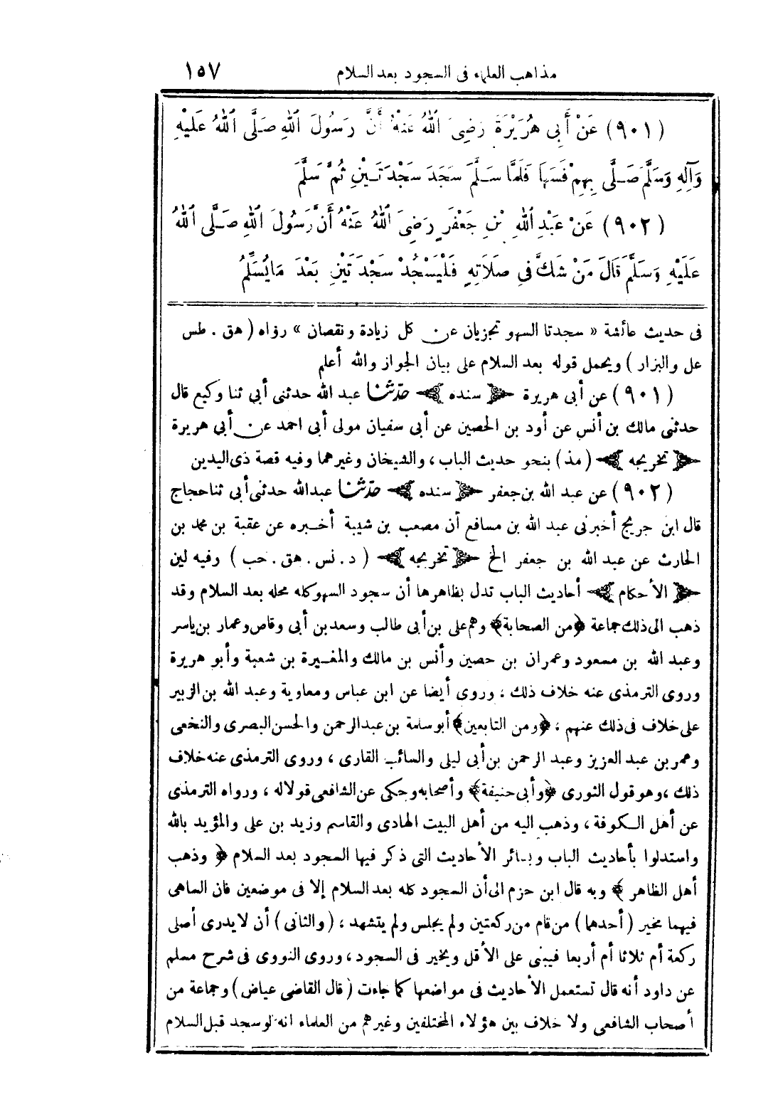 901 - عن أبي هريرة رضي الله عنه أن رسول الله صلى الله عليه وآله وسلم صلى بهم فسها فلما سلم سجد سجدتين ثم سلم. 902 - عن عبد الله بن جعفر رضي الله عنه أن رسول الله صلى الله عليه وسلم قال: من شك في صلاته فليسجد سجدتين بعدما يسلم.