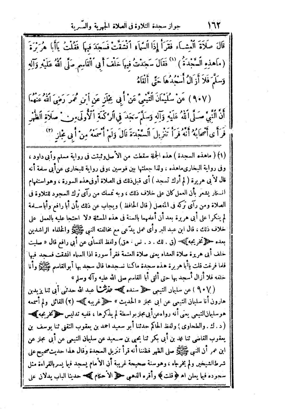 1 - «ما هذه السجدة» هذه الجملة سقطت من الأصل وثبتت في رواية مسلم وأبي داود، وفي رواية البخاري ما هذه، ولذا جعلتها بين قوسين، وفي رواية للبخاري عن أبي سلمة أنه قال لأبي هريرة «لم أرك تسجد» أي قبل ذلك في الصلاة أوفي هذه السورة، وهو استفهام إنكار يشعر بأن العمل كان على خلاف ذلك، وبه تمسك من رأى ترك السجود للتلاوة في الصلاة ومن رأى تركه في المفصل. قال الحافظ: ويجاب عن ذلك بأن أبا رابع وأبا سلمة لم ينكرا على أبي هريرة بعد أن أعلمهما بالسنة في هذه المسألة ولا احتجا عليه بالعمل على خلاف ذلك، قال ابن عبد البر: وأي عمل يدّعى مع مخالفته النبي صلى الله عليه وسلم والخلفاء الراشدين بعده. (تخريجه) (ق. لك. د. نس. هق) ولفظ النسائي عن أبي رافع قال: «صليت خلف أبي هريرة صلاة العشاء يعني صلاة العتمة فقرأ سورة {إِذَا السَّمَاءُ انْشَقَّتْ} [الإنشقاق/1] فسجد فيها فلما فرغت قلت: يا أبا هريرة هذه سجدة ما كنا نسجدها قال: سجد بها أبو القاسم صلى الله عليه وسلم وأنا خلفه فلا أزال أسجد بها حتى ألق أبا القاسم صلى الله عليه وآله وسلم». 907 - عن سليمان التيمي (سنده) حدثنا عبد الله حدثني أبي ثنا يزيد بن هارون أنا سليمان التيمي عن أبي مجلز (الحديث) ز