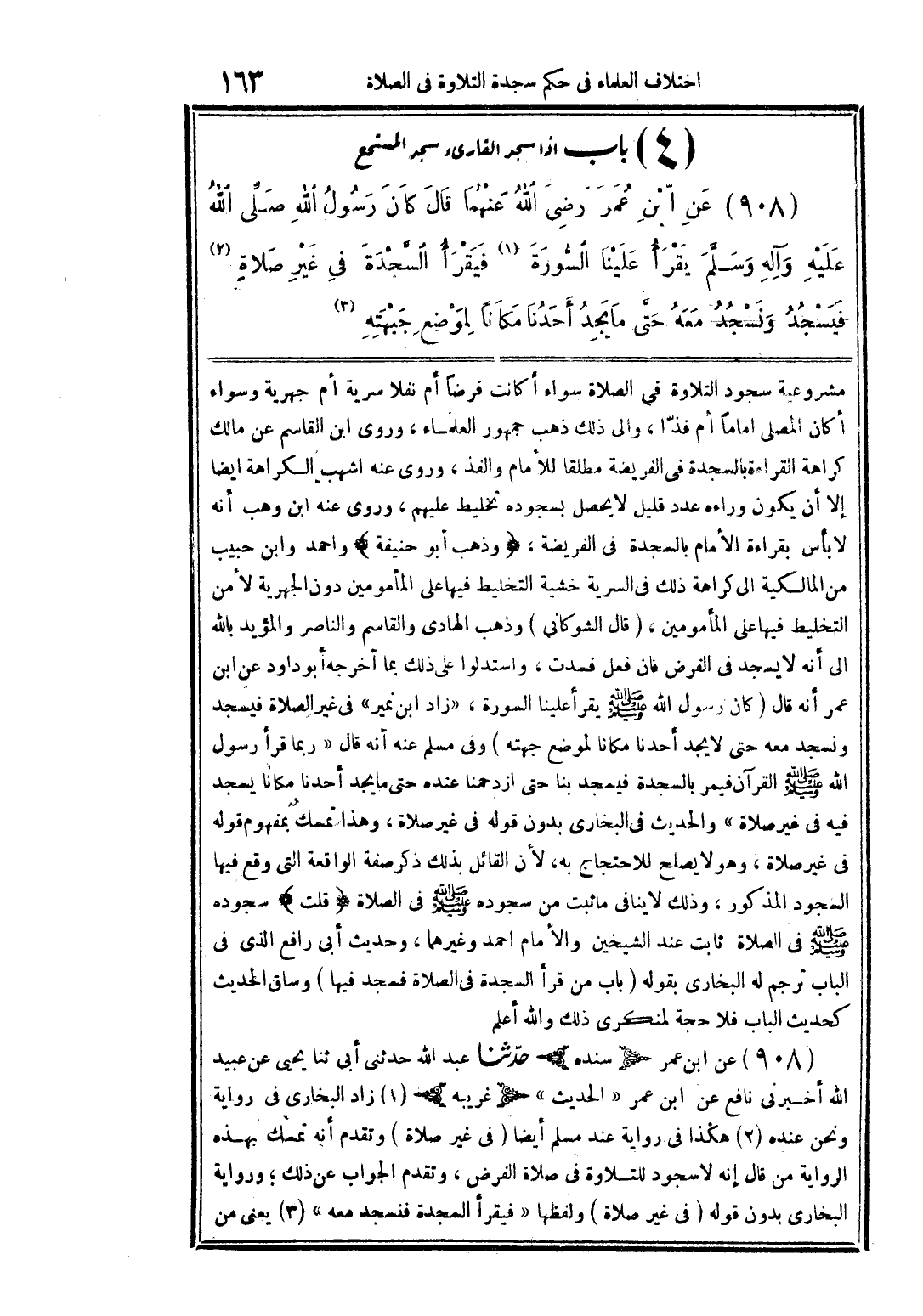 مشروعية سجود التلاوة في الصلاة سواء أكانت فرضًا أم نفلاً سرية أم جهرية وسواء أكان المصلي إمامًا أم فذًا، وإلى ذلك ذهب جمهور العلماء، وروى ابن القاسم عن مالك كراهة القارة بالسجدة في الفريضة مطلقاً للإمام والفذ، وروى عنه أشهب الكراهة أيضًا إلا أن يكون وراءه عدد قليل لا يحصل بسجوده تخليط عليهم، وروى عنه ابن وهب أنه لا بأس بقراءة الإمام بالسجدة في الفريضة. وذهب أبو حنيفة وأحمد وابن حبيب من المالكية إلى كراهة ذلك في السرية خشية التخليط فيها على المأمومين دون الجهرية لأمن التخليط فيها على المأمومين. قال الشوكاني: وذهب الهادي والقاسم والناصر والمؤيد بالله إلى أنه لا يسجد في الفرض فإن فعل فسدت، واستدلوا على ذلك لما أخرجه أبو داود عن ابن عمر أنه قال: «كان رسول الله صلى الله عليه وسلم يقرأ علينا السورة (زاد ابن نمير: «في غير الصلاة») فيسجد ونسجد معه حتى لا يجد أحدنا مكانًا لموضع جهته»، وفي مسلم عنه أنه قال: «ربما قرأ رسول الله صلى الله عليه وسلم القرآن فيمر بالسجدة فيسجد بنا حتى ازدحمنا عنده حتى ما يجد أحدنا مكانًا يسجد فيه في غير صلاة» والحديث في البخاري بدون قوله «في غير صلاة»، وهذا تمسك بمفهوم قوله «في غير صلاة» وهو لا يصلح للاحتجاج به، لأن القائل بذلك ذكر صفة الواقعة التي وقع فيها السجود المذكور، وذلك لا ينافي ما ثبت من سجوده صلى الله عليه وسلم في الصلاة. قلت: سجوده صلى الله عليه وسلم في الصلاة ثابت عند الشيخين والإمام أحمد وغيرهما، وحديث أبي رافع الذي في الباب ترجم له البخاري بقوله «باب من قرأ السجدة في الصلاة فسجد فيها» وساق الحديث كحديث الباب فلا حجة لمنكري ذلك. والله أعلم. 908 - عن ابن عمر (سنده) حدثنا عبد الله حدثني أبي ثنا يحيى عن عبيد الله أخبرني نافع عن ابن عمر (الحديث). (غريبه) 1 - زاد البخاري في رواية «ونحن عنده». 2 - هكذا في رواية عند مسلم أيضًا «في غير صلاة» وتقدم أنه تمسك بهذه الرواية من قال إنه لا سجود للتلاوة في صلاة الفرض، وتقدم الجواب عن ذلك، ورواية البخاري بدون قوله «في غير صلاة» ولفظها «فقرأ السجدة فنسجد معه». 3 - يعني من