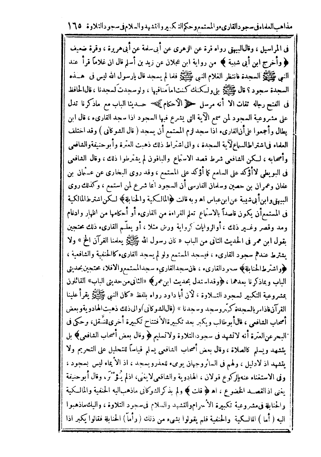 في المراسيل، وقال البيهقي: رواه قرة عن الزهري عن أبي سلمة عن أبي هريرة، وقرة ضعيف. وأخرج ابن أبي شيبة من رواية ابن عجلان عن زيد بن أسلم قال: إن غلامًا قرأ عند النبي صلى الله عليه وسلم السجدة فانتظر الغلام النبي صلى الله عليه وسلم فلما لم يسجد قال: يا رسول الله ليس في هذه السجدة سجود؟ قال صلى الله عليه وسلم: بلى ولكنك كنت إمامَنا فيها، ولو سجدتَ لسجدنا. قال الحافظ في (الفتح): رجاله ثقات إلا أنه مرسل. (الأحكام) حديثا الباب مع ما ذكرنا تدل على مشروعية السجود لمن سمع الآية التي يشرع فيها السجود إذا سجد القارئ. قال ابن بطال: وأجمعوا على أن القارئ إذا سجد لزم المستمع أن يسجد. قال الشوكاني: وقد اختلف العلماء في اشتراط السماء لآية السجدة. وإلى اشتراط ذلك ذهبت العترة وأبو حنيفة والشافعي وأصحابه، لكن الشافعي شرط قصد الاستماع والباقون لم يشترطوا ذلك، وقال الشافعي في (البويطي): لا أؤكد على السامع كما أؤكد على المستمع. وقد روى البخاري عن عثمان بن عفان وعمران بن حصين وسلمان الفارسي أن السجود إنما شرع لمن استمع، وذلك روى البيهقي وابن أبي شيبة عن ابن عباس. اهـ. وبه قالت المالكية والحنابلة، لكن اشترط المالكية في المستمع أن يكون قاصدًا بالاستماع تعلم القراءة من القارئ أو أحكامها من إظهار وإدغام ومد وقصر وغير ذلك، أو الروايات كرواية ورش مثلاً، أو يعلم القارئ ذلك محتجين بقول ابن عمر في الحديث الثاني من الباب «كان رسول الله صلى الله عليه وسلم يعلمنا القرآن» الخ. ولا يشترط عندهم سجود القارئ، فيسجد المستمع ولو لم يسجد القارئ كالحنفية والشافعية. واشترط الحنابلة سجود القارئ، فإن سجد القارئ سجد المستمع وإلا فلا، محتجين بحديثي الباب وبما ذكرنا بعدهما، وقد استدل بحديث ابن عمر (الثاني من حديثي الباب) القائلون بمشروعية التكبير لسجود التلاوة، لأن أبا داود رواه بلفظ «كان النبي صلى الله عليه وسلم يقرأ علينا القرآن فإذا مر بالسجدة كبر وسجد وسجدنا». قال الشوكاني: وإلى ذلك ذهبت الهادوية وبعض أصحاب الشافعي، قال أبو طالب: ويكبر بعد تكبيرة الافتتاح تكبيرة أخرى للنقل، وحكى في (البحر) عن العترة أنه لا تشهد في سجود التلاوة ولا تسليم. وقال بعض أصحاب الشافعي: بل يتشهد ويسلم كالصلاة، وقال بعض أصحاب الشافعي: يسلم قياسًا للتحليل على التحريم، ولا يتشهد إذ لا دليل. ولهم في السائر وجهان: يومئ للعذر ويسجد، إذ الإيماء ليس بسجود، وفي الاستغناء عنه بالركوع قولان: الهادوية والشافعي لا يغني، إذ لم يؤثر، وقال أبو حنيفة: يغني إذ القصد الخضوع. اهـ. قلت: ولم يذكر الشوكاني ما ذهب إليه الحنفية والمالكية والحنابلة في مشروعية تكبيرة الإحرام والتشهد والسلام في سجود التلاوة، وإليك ما ذهبوا إليه: أما المالكية والحنفية فلم يقولوا بشيء من ذلك. وأما الحنابلة فقالوا: يكبر إذا