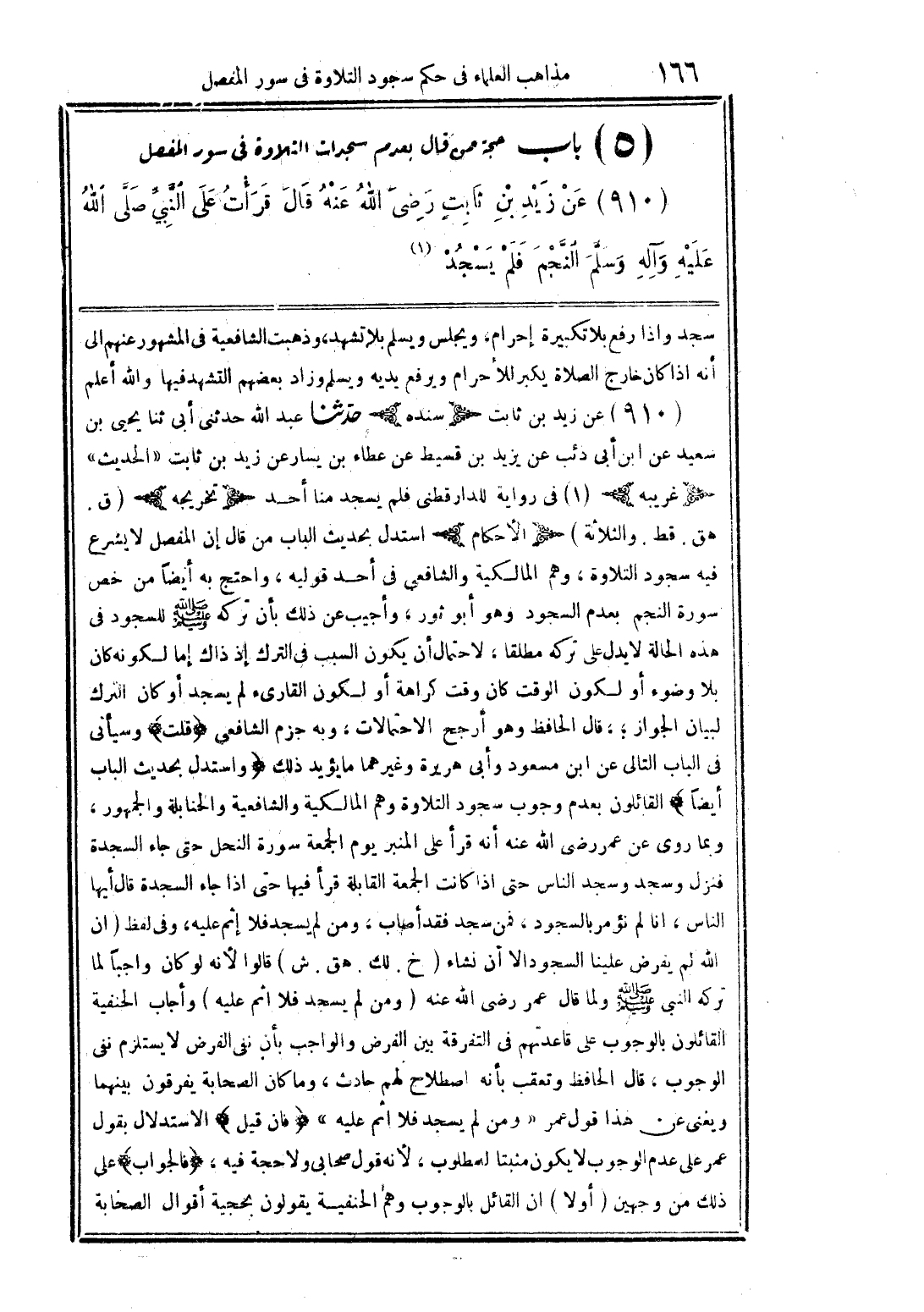 5 - باب حجة من قال بعدم سجدات التلاوة في سور المفصل 910 - عن زيد بن ثابت رضي الله عنه قال: قرأت على النبي صلى الله عليه وآله وسلم النجم فلم يسجد (1).