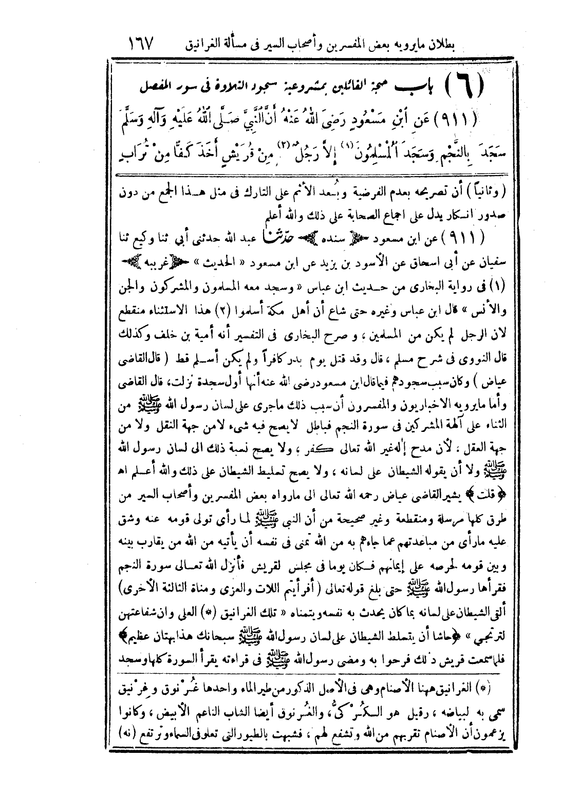 وثانيًا: أن تصريحه بعدم الفرضية ويعد الإثم على التارك في مثل هذا الجمع من دون صدور إنكار يدل على إجماع الصحابة على ذلك، والله أعلم. 911 - عن ابن مسعود (سنده) حدثنا عبد الله حدثني أبي ثنا وكيف ثنا سفيان عن أبي إسحاق عن الأسود بن يزيد عن ابن مسعود (الحديث). (غريبه) 1 - في رواية البخاري من حديث ابن عباس «وسجد معه المسلمون والمشركون والجن والإنس»، قال ابن عباس وغيره «حتى شاع أن أهل مكة أسلموا». 2 - هذا الاستثناء منقطع لأن الرج لم يكن من المسلمين، وصرح البخاري في التفسير أنه أمية بن خلف، وكذلك قال النووي في شرح مسلم، قال: وقد قتل يوم بدر كافرًا ولم يكن أسلم قط. قال القاضي عياض: وكان سبب سجودهم فيما قال ابن مسعود رضي الله عنه: أنها أول سجدة نزلت. قال القاضي: وأما ما يرويه الإخباريون والمفسرون أن سبب ذلك ما جرى على لسان رسول الله صلى الله عليه وسلم من الثناء على آلهة المشركين في سورة النجم فباطل لا يصح في شيء لا من جهة النقل ولا من جهة العقل، لأن مدح إله غير الله تعالى كفر، ولا يصح نسبة ذلك إلى لسان رسول الله صلى الله عليه وسلم ولا أن يقوله الشيطان على لسانه، ولا يصح تسليط الشيطان على ذلك، والله أعلم. اهـ. قلت: يشير القاضي عياض رحمه الله تعالى إلى ما رواه بعض المفسرين وأصحاب السير من طرق كلها مرسلة ومنقطعة وغير صحيحة من أن النبي صلى الله عليه وسلم لما رأى تولي قومه عنه وشق عليه ما رأى من مباعدتهم عما جاءهم به من الله تمنى في نفسه أن يأتيه من الله من يقارب بينه وبين قومه لحرصه على إيمانهم فكان يومًا في مجلس لقريش فأنزل الله تعالى سورة النجم فقرأها رسول الله صلى الله عليه وسلم حتى بلغ قوله تعالى {أَفَرَأَيْتُمُ اللَّاتَ وَالْعُزَّى (19) وَمَنَاةَ الثَّالِثَةَ الْأُخْرَى} [النجم/19، 20] ألقى الشيطان على لسانه بما كان يحدث به نفسه ويتمناه «تلك الغرانيق (*) العلى وإن شفاعتهن لترتجى» (حاشا أن يتسلط الشيطان على لسان رسول الله صلى الله عليه وسلم سبحانك هذا بهتان عظيم) فلما سمعت قريش ذلك فرحوا به ومضى رسول الله صلى الله عليه وسلم في قراءته يقرأ السورة كلها وسجد