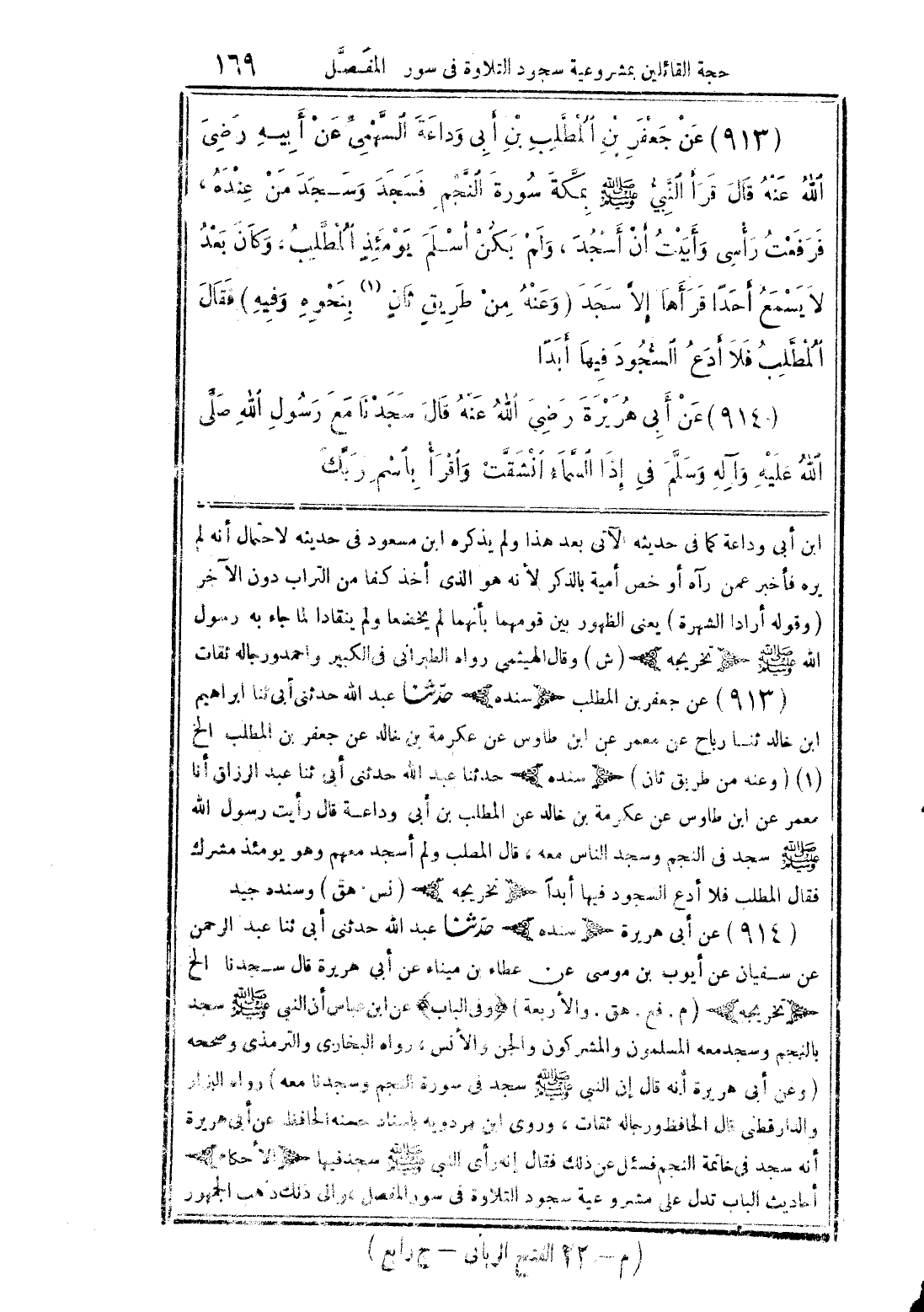 913 - عن جعفر بن المطلب بن أبي وداعة السهمي عن أبي رضي الله عنه قال: قرأ النبي صلى الله عليه وسلم بمكة سورة النجم فسجد وسجد من عنده، فرفعت رأسي وأبيت أن أسجد، ولم يكن أسلم يومئذ المطلب، وكان بعد لا يسمع أحدًا قرأها إلا سجد. وعنه من طريق ثان (1) بنحوه، وفيه «فقال المطلب فلا أدع السجود فيها أبدًا». 914 - عن أبي هريرة رضي الله عنه قال: سجدنا مع رسول الله صلى الله عليه وآله وسلم في {إِذَا السَّمَاءُ انْشَقَّتْ} [الإنشقاق/1] و {اقْرَأْ بِاسْمِ رَبِّكَ} [العلق/1].