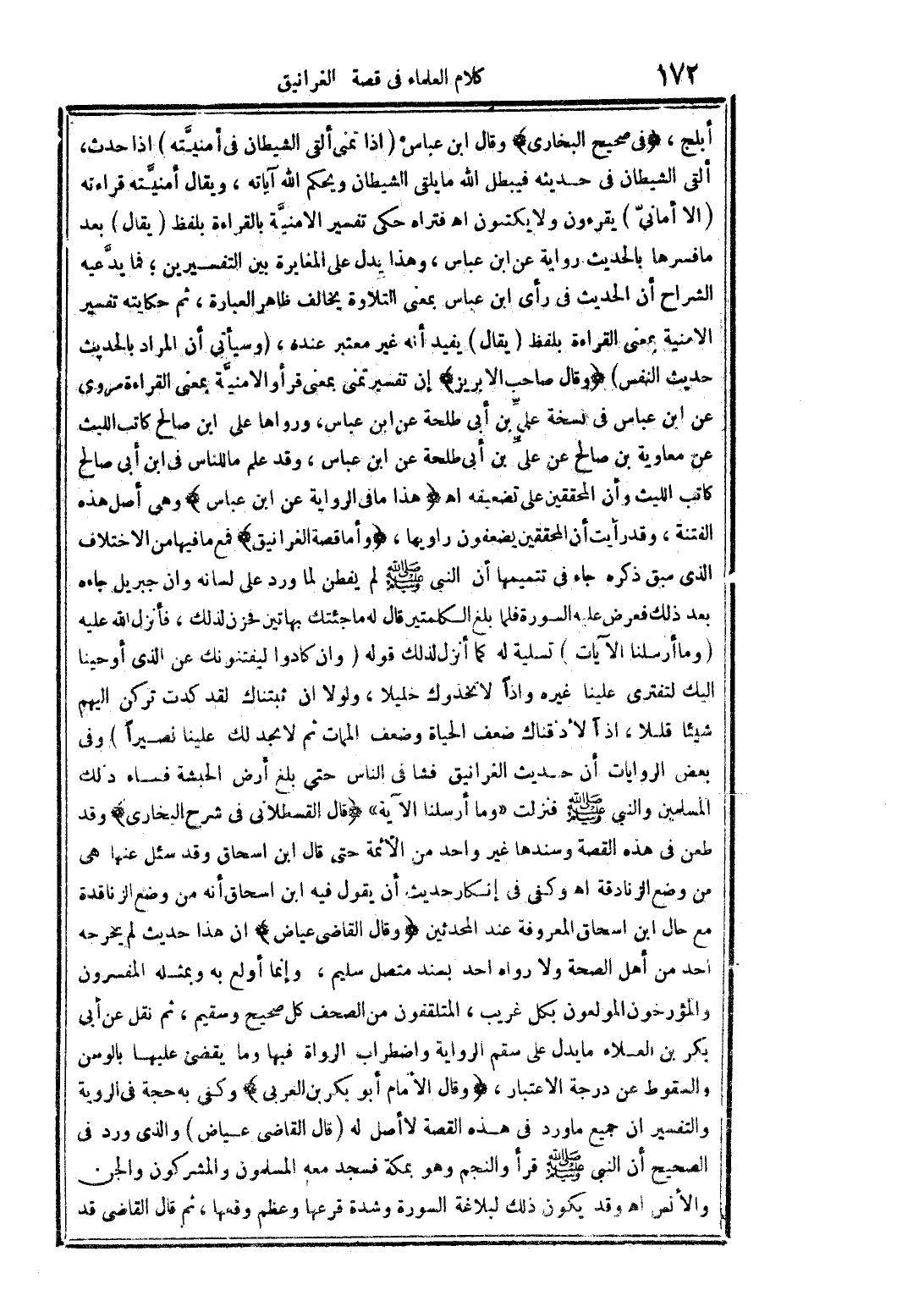 أبلج. في صحيح البخاري: وقال ابن عباس {إِذَا تَمَنَّى أَلْقَى الشَّيْطَانُ فِي أُمْنِيَّتِهِ} [الحج/52] إذا حدث، ألقى الشيطان في حديثه فيبطل الله ما يلقي الشيطان ويحكم الله آياته، ويقال: أمنيته قراءته {إِلَّا أَمَانِيَّ} [البقرة/78] يقرئون ولا يكتبون. اهـ. فتراه حكى تفسير الأمنية بالقراءة بلفظ «يقال» بعدما فسرها بالحديث رواية عن ابن عباس. وهذا يدل على المغايرة بين التفسيرين. فما يدعيه الشراح أن الحديث في رأي ابن عباس بمعنى التلاوة يخالف ظاهرة العبارة. ثم حكايته تفسير الأمنية بمعنى القراءة بلفظ «يقال» يفيد أنه غير معتبر عنده. (وسيأتي أن المراد بالحديث حديث النفس). وقال صاحب (الإبريز): إن تفسير تمنى بمعنى قرأ، والأمنية بمعنى القراءة، مروي عن ابن عباس في نسخة علي بن أبي طلحة عن ابن عباس، ورواها على ابن صالح كاتب الليث عن معاوية بن صالح عن علي بن أبي طلحة عن ابن عباس، وقد علم ما للناس في ابن صالح كاتب الليث وأن المحققين على تضعفيه. اهـ. هذا ما في الرواية عن ابن عباس، وهي أصل هذه الفتنة، وقد رأيت أن المحققين يضعفون راويها. وأما قصة الغرانيق فمع فما فيها من الاختلاف الذي سبق ذكره جاء في تتميمها أن النبي صلى الله عليه وسلم لم يفطن لما ورد على لسانه وأن جبريل جاءه بعد ذلك فعرض عليه السورة فلما بلغ الكلمتين قال له: ما جئتك بهاتين فحزن لذلك، فأنزل الله عليه {وَمَا أَرْسَلْنَا} [الحج/52] الآيات تسلية له كما أنزل لذلك قوله {وَإِن كَادُوا لَيَفْتِنُونَكَ عَنِ الَّذِي أَوْحَيْنَا إِلَيْكَ لِتَفْتَرِيَ عَلَيْنَا غَيْرَهُ وَإِذاً لاَّتَّخَذُوكَ خَلِيلاً (73) وَلَوْلا أَن ثَبَّتْنَاكَ لَقَدْ كِدتَّ تَرْكَنُ إِلَيْهِمْ شَيْئاً قَلِيلاً (74) إِذاً لأَذَقْنَاكَ ضِعْفَ الحَيَاةِ وَضِعْفَ المَمَاتِ ثُمَّ لاَ تَجِدُ لَكَ عَلَيْنَا نَصِيراً} [الإسراء/73 - 75] وفي بعض الروايات أن حديث الغرانيق فشا في الناس حتى بلغ أرض الحبشة فساء ذلك المسلمين والنبي صلى الله عليه وسلم فنزلت {وَمَا أَرْسَلْنَا} الآية. قال القسطلاني في (شرح البخاري): وقد طعن في هذه القصة وسندها غير واحد من الأئمة، حتى قال ابن إسحاق وقد سئل عنها: هي من وضع الزنادقة. اهـ. وكفى في إنكار حديث أن يقول فيه ابن إسحاق أنه من وضع الزنادقة مع حال ابن إسحاق المعروفة عند المحدثين. وقال القاضي عياض: إن هذا حديث لم يخرجه أحد من أهل الصحة ولا رواه أحد بسند متصل سليم، وإنما أولع به وبمثله المفسرون والمؤرخون المولعون بكل غريب، والمتلقفون من الصحف كل صحيح وسقيم. ثم نقل عن أبي بكر بن العلاء ما يدل على سقم الرواية واضطراب الرواة فيها وما يقضي عليها بالوهن والسقوط عن درجة الاعتبار. وقال الإمام أبو بكر بن العربي، وكفى به حجة في الرواية والتفسير: إن جميع ما ورد في هذه القصة لا أصل له. قال القاضي عياض: والذي ورد في الصحيح أن النبي صلى الله عليه وسلم قرأ {وَالنَّجْمِ} وهو بمكة فسجد معه المسلمون والمشركون والجن والإنس. اهـ. وقد يكون ذلك لبلاغة السورة وشدة قرعها وعظم وقعها، ثم قال القاضي: قد