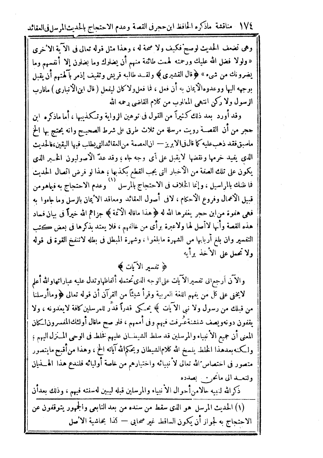 وهي تضعف الحديث لو صح، فكيف ولا صحة له؟ وهذا مثل قوله تعالى في الآية الأخرى {وَلَوْلا فَضْلُ اللَّهِ عَلَيْكَ وَرَحْمَتُهُ لَهَمَّت طَّائِفَةٌ مِّنْهُمْ أَن يُضِلُّوكَ وَمَا يُضِلُّونَ إِلاَّ أَنفُسَهُمْ وَمَا يَضُرُّونَكَ مِن شَيْءٍ} [النساء/113] قال القشيري: ولقد طالبه قريش وثقيف إذ مر بآلهتهم أن يقبل لوجهه إليها ووعدوه الإيمان به إن فعل، فما فعل ولا كان ليفعل. قال ابن الأنباري: ما قارب الرسول ولا ركن. انتهى المطلوب من كلام القاضي رحمه الله. وقد أورد بعد ذلك كثيرًا من القول في توهين الرواية وتكذيبها. أما ما ذكره ابن حجر من أن القصة رويت مرسلة من ثلاث طرق على شرط الصحيح وأنه يحتج بها الخ ما سبق، فقد ذهب عليه كما قال في (الإبريز) أن العصمة من العقائد التي يطلب فيها اليقين، فالحديث الذي يفيد خرمها ونقضها لا يقبل على أي وجه جاء، وقد عد الأصوليون الخبر الذي يكون على تلك الصفة من الأخبار التي يجب القطع بكذبها، هذا لو فرض اتصال الحديث فما ظنك بالمراسيل، وإنما الخلاف في الاحتجاج بالمرسل (1) وعدم الاحتجاج به فيما هو من قبيل الأعمال وفروع الأحكام، لا في أصول العقائد ومعاقد الإيمان بالرسل وما جاءوا به فهي هفوة من ابن حجر يغفرها الله له. هذا ما قاله الأئمة جزاهم الله خيرًا في بيان فساد هذه القصة، وأنها لا أصل لها، ولا عبرة برأي من خالفهم، فلا يعتد بذكرها في بعض كتب التفسير وإن بلغ أربابها من الشهرة ما بلغوا، وشهرة المبطل في بطله لا تنفخ القوة في قوله ولا تحمل على الأخذ برأيه. (تفسير الآيات) والآن أرجع إلى تفسير الآيات على الوجه الذي تحتمله ألفاظها وتدل عليه عباراتها والله أعلم. لا يخفى على كل من يفهم اللغة العربية، وقرأ شيئًا من القرآن أن قوله تعالى: {وَمَا أَرْسَلْنَا مِن قَبْلِكَ مِن رَّسُولٍ وَلاَ نَبِيٍّ} [الحج/52] الآيات، يحكي قدرًا قُدِّرَ للمرسلين كافة لا يعدونه، ولا يقفون دونه، ويصف شنشنة عُرفت فيهم وفي أممهم، فلو صح ما قال أولئك المفسرون لكان المعنى أن جميع الأنبياء والمرسلين قد سلط الشيطان عليهم، فخلط في الوحي المُنَزَّل إليهم، ولكنه بعد هذا الخلط ينسخ الله كلام الشيطان ويحكم الله آياته ... إلخ، وهذا من أقبح ما يتصور متصور في اختصاص الله تعالى لأنبيائه، واختيارهم من خاصة أوليائه، فلندع هذا الهذيان ولنعد إلى ما نحن بصدده. ذكر الله لنبيه حالاً من أحوال الأنبياء والمرسلين قبله ليبين له سنته فيهم، وذلك بعد أن