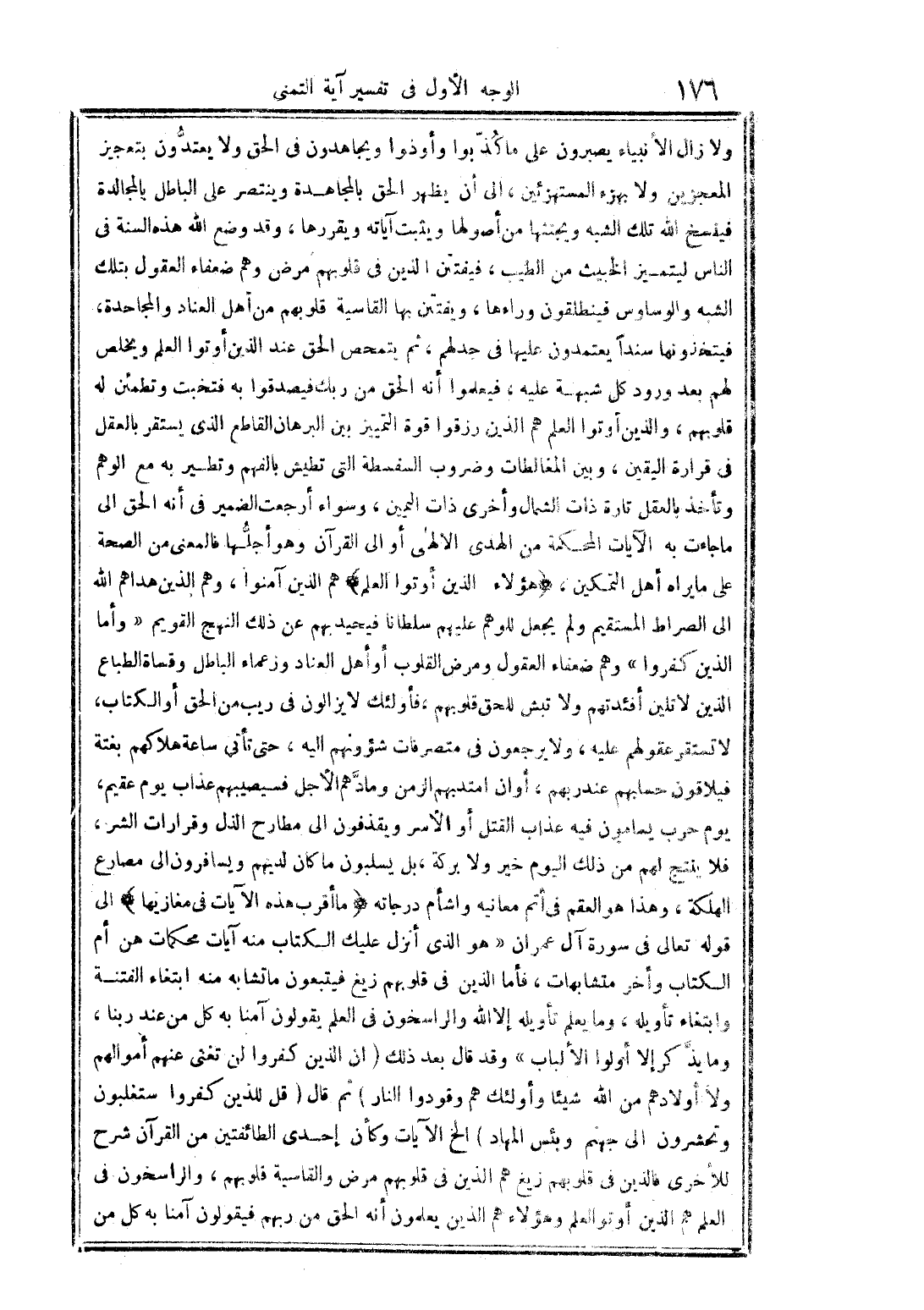 ولا يزال الأنبياء يصبرون على ما كُذِّبوا وأوذوا، ويجاهدون في الحق، ولا يعتدَّون بتعجيز المعجزين، ولا بهزء المستهزئين، إلى أن يظهر الحق بالمجاهدة، وينتصر على الباطل بالمجالدة، فينسخ الله تلك الشبهة، ويجتثها من أصولها، ويثبت آياته ويقررها، وقد وضع الله هذه السنة في الناس ليتميز الخبيث من الطيب، فيفتتن الذين في قلوبهم مرض -وهم ضعفاء العقول- بتلك الشبه والوساوس، فينطلقون وراءها، ويفتتن بها القاسية قلوبهم من أهل العناد والمجاحدة فيتخذونها سندًا يعتمدون عليها في جدلهم، ثم يتمحص الحق عند الذين أوتوا العلم، ويخلص لهم بعد ورود كل شبهة عليه، فيعلموا أنه الحق من ربك، فيصدِّقوا به فتخبت وتطمئن له قلوبهم. والذين أوتوا العلم هم الذين رزقوا قوة التمييز بين البرهان القاطع الذي يستقر بالعقل في قرارة اليقين، وبين المغالطات وضروب السفسطة التي تطيش بالفهم، وتطير به مع الوهم، وتأخذ بالعقل تارة ذات الشمال وأخرى ذات اليمين. وسواء أرجعت الضمير في {أَنَّهُ الْحَقُّ} [الحج/54]: إلى ما جاءت به الآيات المحكمة من الهدى الإلهي، أو إلى القرآن وهو أجلها، فالمعنى من الصحة على ما يراه أهل التمكين. هؤلاء الذين أوتوا العلم هم الذين آمنوا، وهم الذين هداهم الله إلى الصراط المستقيم، ولم يجعل للوهم عليهم سلطانًا، فيحيد بهم عن ذلك النهج القويم، وأما الذين كفروا وهم ضعفاء العقول ومرضى القلوب، أو أهل العناد وزعماء الباطل وقساة الطباع الذين لا تلين أفئدتهم، ولا تبش للحق قلوبهم، فأولئك لا يزالون في ريب من الحق أو الكتاب لا تستقر عقولهم عليه، ولا يرجعون في متصرفات شئونهم إليه، حتى تأتي ساعة هلاكهم بغتة، فيلاقون حسابهم عند ربهم، أو إن امتد بهم الزمن، ومادَّهم الأجل، فسيصيبهم {عَذَابُ يَوْمٍ عَقِيمٍ} [الحج/55] يوم حرب يسامون فيه سوء عذاب القتل أو الأسر، ويقذفون إلى مطارح الذل وقرارات الشر، فلا ينتج لهم من ذلك اليوم خير ولا بركة، بل يسلبون ما كان لديهم، ويساقون إلى مصارع الهلكة، وهذا هو العقم في أتم معانيه وأشأم درجاته. ما أقرب هذه الآيات في مغازيها إلى قوله تعالى في سورة آل عمران: {هُوَ الَّذِي أَنزَلَ عَلَيْكَ الكِتَابَ مِنْهُ آيَاتٌ مُّحْكَمَاتٌ هُنَّ أُمُّ الكِتَابِ وَأُخَرُ مُتَشَابِهَاتٌ فَأَمَّا الَّذِينَ فِي قُلُوبِهِمْ زَيْغٌ فَيَتَّبِعُونَ مَا تَشَابَهَ مِنْهُ ابْتِغَاءَ الفِتْنَةِ وَابْتِغَاءَ تَأَوِيلِهِ وَمَا يَعْلَمُ تَأْوِيلَهُ إِلاَّ اللَّهُ وَالرَّاسِخُونَ فِي العِلْمِ يَقُولُونَ آمَنَّا بِهِ كُلٌّ مِّنْ عِندِ رَبِّنَا وَمَا يَذَّكَّرُ إِلاَّ أُوْلُوا الأَلْبَابِ} [آل عمران/7] وقد قال بعد ذلك: {إِنَّ الَّذِينَ كَفَرُوا لَن تُغْنِيَ عَنْهُمْ أَمْوَالُهُمْ وَلاَ أَوْلادُهُم مِّنَ اللَّهِ شَيْئاً وَأُوْلَئِكَ هُمْ وَقُودُ النَّارِ} [آل عمران/10] ثم قال: {قُل لِّلَّذِينَ كَفَرُوا سَتُغْلَبُونَ وَتُحْشَرُونَ إِلَى جَهَنَّمَ وَبِئْسَ المِهَادُ} [آل عمران/ 12] ... إلخ الآيات، وكأن إحدى الطائفتين من القرآن شرح للأخرى، فالذين في قلوبهم زيغ هم الذين في قلوبهم مرض والقاسية قلوبهم، والراسخون في العلم هم الذين أوتوا العلم، وهؤلاء هم الذين يعلمون أنه الحق من ربهم فيقولون: آمنا به كل من