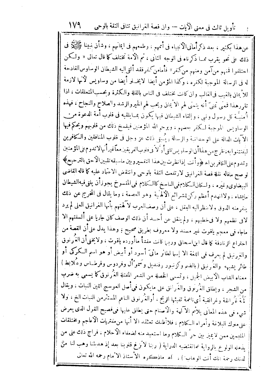 عن هذا بكثير، قال بعد ذكر أماني الأنبياء في أممهم وطمعهم في إيمانهم، وشأن نبينا صلى الله عليه وسلم في ذلك على نحو يقرب مما ذكرناه في الوجه الثاني: «ثم الأمة تختلف كما قال تعالى: {وَلَكِنِ اخْتَلَفُوا فَمِنْهُم مَّنْ آمَنَ وَمِنْهُم مَّن كَفَرَ} [البقرة/253] فأما من كفر فقد ألقى إليه الشيطان الوساوس القادحة له في الرسالة الموجبة لكفره، وكذا المؤمن أيضًا لا يخلو أيضًا من وساويس، لأنها لازمة للإيمان بالغيب في الغالب، وإن كانت تختلف في الناس بالقلة والكثرة وبحسب المتعلقات، إذا تقرر هذا فمعنى تمنى أنه يتمنى لهم الإيمان ويحب لهم الخير والرشد والصلاح والنجاح، فهذه أمنية كل رسول ونبي، وإلقاء الشيطان فيها يكون بما يلقيه في قلوب أمة الدعوة من الوساويس الموجبة لكفر بعضهم، ويرحم الله المؤمنين، فينسخ ذلك من قلوبهم ويحكم فيها الآيات الدالة على الوحدانية والرسالة، ويبقي ذلك عز وجل في قلوب المنافقين والكافرين ليفتتنوا به، فخرج من هذا أن الوساويس تُلقى أولاً في قلوب الفريقين معًا غير أنها لا تدوم على المؤمنين وتدوم على الكافرين» اهـ. وأنت إذا نظرت بين هذا التفسير وبين ما سبقه تتبين الأحق بالترجيح. لو صح ما قاله نقلة قصة الغرانيق لارتفعت الثقة بالوحي، وانتقض الاعتماد عليه كما قاله القاضي البيضاوي وغيره، ولكان الكلام في الناسخ كالكلام في المنسوخ يجوز أن يلقي فيه الشيطان ما يشاء ولانهدم أعظم ركن للشرائع الإلهية وهو العصمة، وما يقال في المخرج عن ذلك ينفر منه الذوق ولا ينظر إليه العقل، على أن وصف العرب لآلهتهم بأنها الغرانيق العُلى لم يرِد لا في نظمهم ولا في خطبهم، ولم ينقل عن أحد أن ذلك الوصف كان جاريًا على ألسنتهم إلا ما جاء في معجم ياقوت غير مسند ولا معروف بطريق صحيح، وهذا يدل على أن القصة من