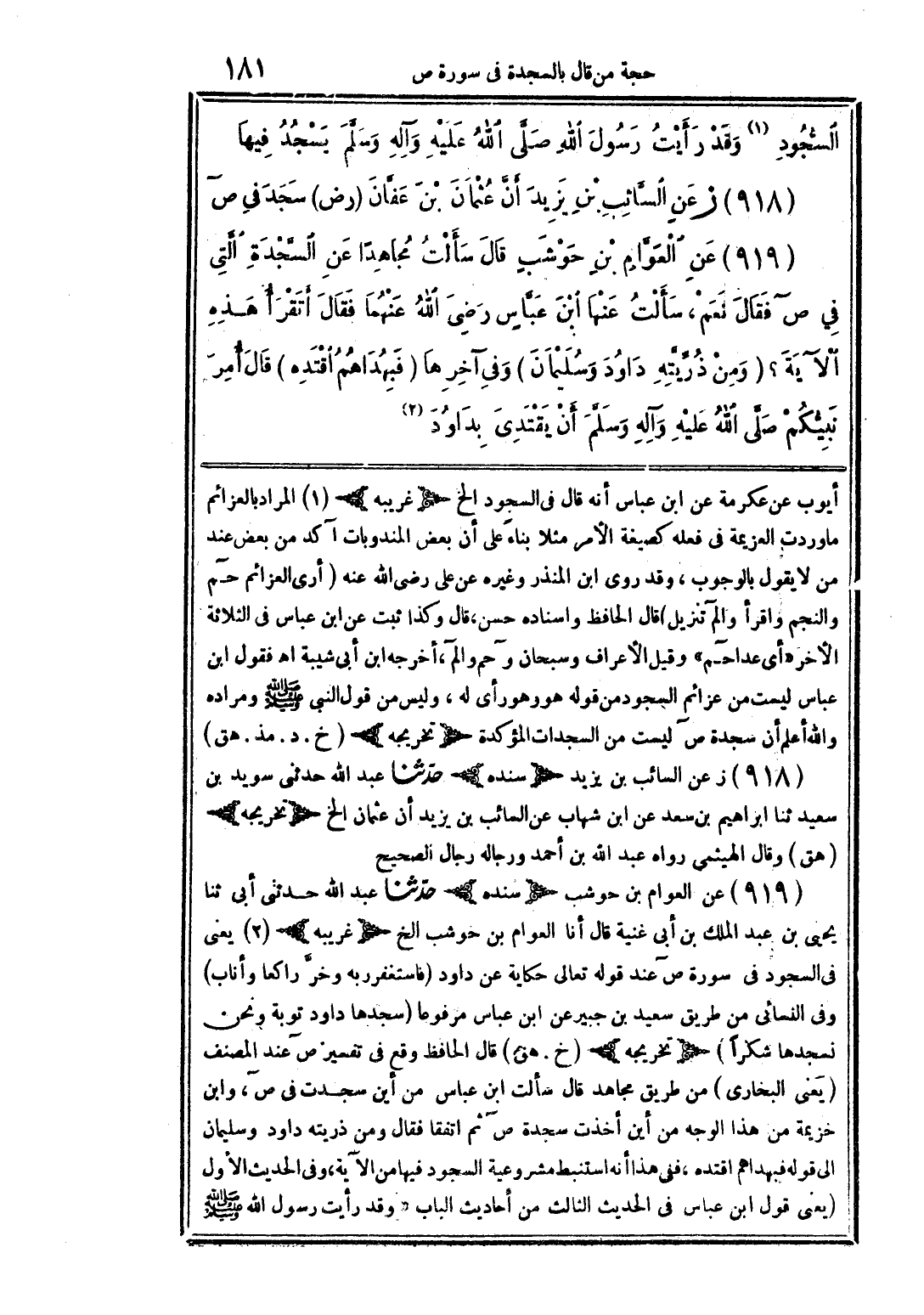 السجود (1) وقد رأيت رسول الله صلى الله عليه وآله وسلم يسجد فيها. 918 - ز. عن السائب بن يزيد أن عثمان بن عفان (رض) سجد في ص. 919 - عن العوام بن حوشب قال: سألت مجاهدًا عن السجدة التي في ص فقال: نعم، سألت عنها ابن عباس رضي الله عنهما فقال: أتقرأ هذه الآية؟ {وَمِنْ ذُرِّيَّتِهِ دَاوُودَ وَسُلَيْمَانَ} [الأنعام/84] وفي آخرها {فَبِهُدَاهُمُ اقْتَدِهِ} [الأنعام/90] قال: أُمر نبيكم صلى الله عليه وآله وسلم أن يقتدي بداود (2).
