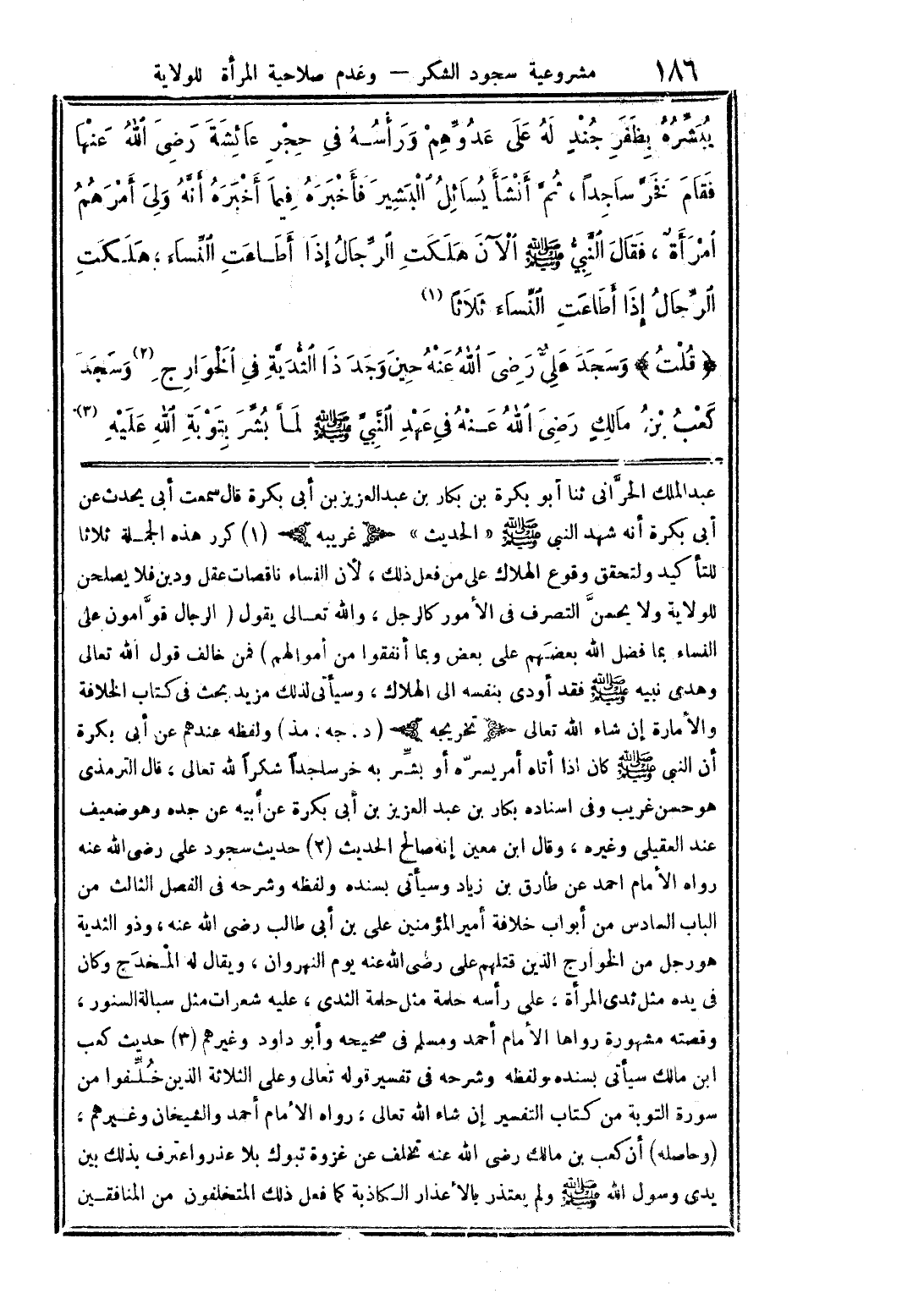 عبد الملك الحراني ثنا أبو بكرة بن بكار بن عبد العزيز بن أبي بكرة قال سمعت أبي يحدث عن أبي بكرة أنه شهد النبي صلى الله عليه وسلم (الحديث). (غريبه) 1 - كرر هذه الجملة ثلاثًا للتأكيد ولتحقق وقوع الهلاك على من فعل ذلك، لأن النساء ناقصات عقل ودين فلا يصلحن للولاية ولا يحسنّ التصرف في الأمور كالرجل، والله تعالى يقول: {الرِّجَالُ قَوَّامُونَ عَلَى النِّسَاءِ بِمَا فَضَّلَ اللَّهُ بَعْضَهُمْ عَلَى بَعْضٍ وَبِمَا أَنْفَقُوا مِنْ أَمْوَالِهِمْ} [النساء/34] فمن خالف قول الله تعالى وهدي نبيه صلى الله عليه وسلم فقد أودى بنفسه إلى الهلاك، وسيأتي لذلك مزيد بحث في كتاب الخلافة والإمارة إن شاء الله تعالى. (تخريجه) (د. جه. مذ) ولفظه عندهم عن أبي بكرة أن النبي صلى الله عليه وسلم كان إذا أتاه أمر يسره أو بشر به خر ساجدًا شكرًا لله تعالى، قال الترمذي: هو حسن غريب، وفي إسناده بكار بن عبد العزيز بن أبي بكرة عن أبيه عن جده وهو ضعيف عند العقيلي وغيره، وقال ابن معين: إنه صالح الحديث. 2 - حديث سجود علي رضي الله عنه رواه الإمام أحمد عن طارق بن زياد وسيأتي بسنده ولفظه وشرحه في الفصل الثالث من الباب السادس من أبواب خلافة أمير المؤمنين علي بن أبي طالب رضي الله عنه، وذو الثدية هو رجل من الخوارج الذين قتلهم علي رضي الله عنه يوم النهروان، ويقال: له المخدج وكان في يده مثل ثدي المرأة، على رأسه حلمة مثل حلمة الثدي، عليه شعرات مثل سبالة السنور، وقصته مشهورة رواها الإمام أحمد ومسلم في صحيحه وأبو داود وغيرهم. 3 - حديث كعب بن مالك سيأتي بسنده ولفظه وشرحه في تفسير قوله تعالى {وَعَلَى الثَّلَاثَةِ الَّذِينَ خُلِّفُوا} [التوبة/118] من سورة التوبة من كتاب التفسير إن شاء الله تعالى، رواه الإمام أحمد والشيخان وغيرهم، وحاصله أن كعب بن مالك رضي الله عنه تخلف عن غزوة تبوك بلا عذر واعترف بذلك بين يدي رسول الله صلى الله عليه وسلم ولم يعتذر بالأعذار الكاذبة كما فعل المتخلفون من المنافقين