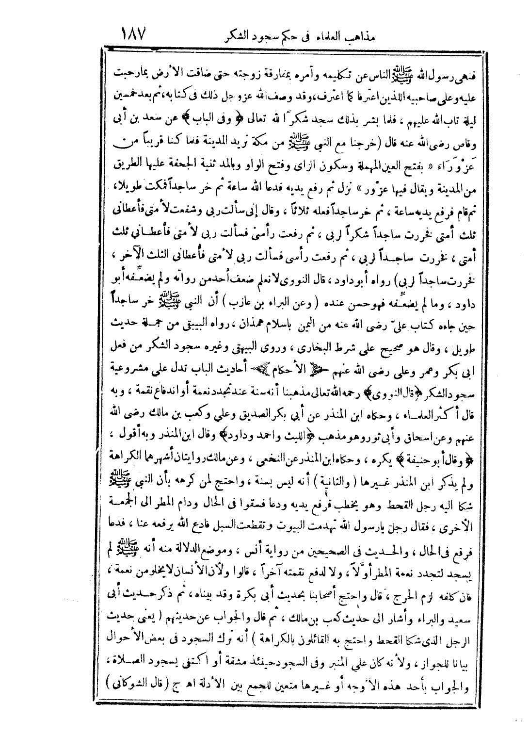 فنهى رسول الله صلى الله عليه وسلم الناس عن تكليمه وأمره بمفارقة زوجته، حتى ضاقت الأرض بما رحبت عليه وعلى صاحبيه اللذين اعترفا كما اعترف، وقد وصف الله عز وجل ذلك في كتاب، ثم بعد خمسين ليلة تاب الله عليهم، فلما بشر بذلك سجد شكرًا لله تعلى. وفي الباب عن سعد بن أبي وقاص رضي الله عنه قال: «خرجنا مع النبي صلى الله عليه وسلم من مكة نريد المدينة فلما كنا قريبًا من عزوراء (بفتح العين المهملة وسكون الزاي وفتح الواو وبالمد ثنية الجحفة عليها الطريق من المدينة ويقال فيها عزور) نزل ثم رفع يديه فدعا الله ساعة ثم خر ساجدًا فمكث طويلاً، ثم قام فرفع يديه ساعة، ثم خر ساجدًا فعله ثلاثُا، وقال: إني سألت ربي وشفعت لأمتي فأعطاني ثلث أمتي فخررت ساجدًا شكرًا لربي، ثم رفعت رأسي فسألت ربي لأمتي فأعطاني ثلث أمتي، فخررت ساجدًا لربي، ثم رفعت رأسي فسألت ربي لأمتي فأعطاني الثلث الآخر، فخررت ساجدًا لربي» رواه أبو داود، قال النووي: لا نعلم ضعف أحد من رواته ولم يضعفه أبو داود، ولما لم يضعفه فهو حسن عنده. وعن البراء بن عازب أن النبي صلى الله عليه وسلم خر ساجدًا حين جاءه كتاب علي رضي الله عنه من اليمن بإسلام همذان، رواه البيهقي من جملة حديث طويل، وقال: هو صحيح على شرط البخاري، وروى البيهقي وغيره سجود الشكر من فعل أبي بكر وعمر وعلي رضي الله عنهم. (الأحكام) أحاديث الباب تدل على مشروعية سجود الشكر. قال النووي رحمه الله تعالى: مذهبنا أنه سنة عند تجدد نعمة أو اندفاع نقمة، وبه قال أكثر العلماء، وحكاه ابن المنذر عن أبي بكر الصديق وعلي وكعب بن مالك رضي الله عنهم وعن إسحاق وأبي ثور وهو مذهب الليث وأحمد وداود، وقال ابن المنذر: وبه أقول، وقال أبو حنيفة: يكره، وحكاه ابن المنذر عن النخعي، وعن مالك روايتان أشهرهما الكراهة، ولم يذكر ابن المنذر غيرها، والثانية: أنه ليس بسنة، واحتج لمن كرهه بأن النبي صلى الله عليه وسلم شكا إليه رجل القحط وهو يخطب فرفع يديه ودعا فسقوا في الحال ودام المطر إلى الجمعة الأخرى، فقال رجل: يا رسول الله تهدمت البيوت وتقطعت السبل فادع الله يرفعه عنا، فدعا فرفع في الحال، والحديث في الصحيحين من رواية أنس، وموضع الدلالة منه أنه صلى الله عليه وسلم لم يسجد لتجدد نعمة المطر أولاً، ولا لدفع نقمته آخرًا، قالوا: ولأن الإنسان لا يخلو من نعمة، فإن كلفه لزم الحرج، قال: واحتج أصحابنا بحديث أبي بكرة وقد بيناه، ثم ذكر حديث أبي سعيد والبراء وأشار إلى حديث كعب بن مالك، ثم قال: والجواب عن حديثهم (يعني حديث الرجل الذي شكا القحط واحتج به القائلون بالكراهة) أنه ترك السجود في بعض الأحوال بيانًا للجواز، ولأنه كان على المنبر وفي السجود حينئذ مشقة أو اكتفى بسجود الصلاة، والجواب بأحد هذه الأوجه أو غيرها متعين للجمع بين الأدلة. اهـ. ج. قال الشوكاني: