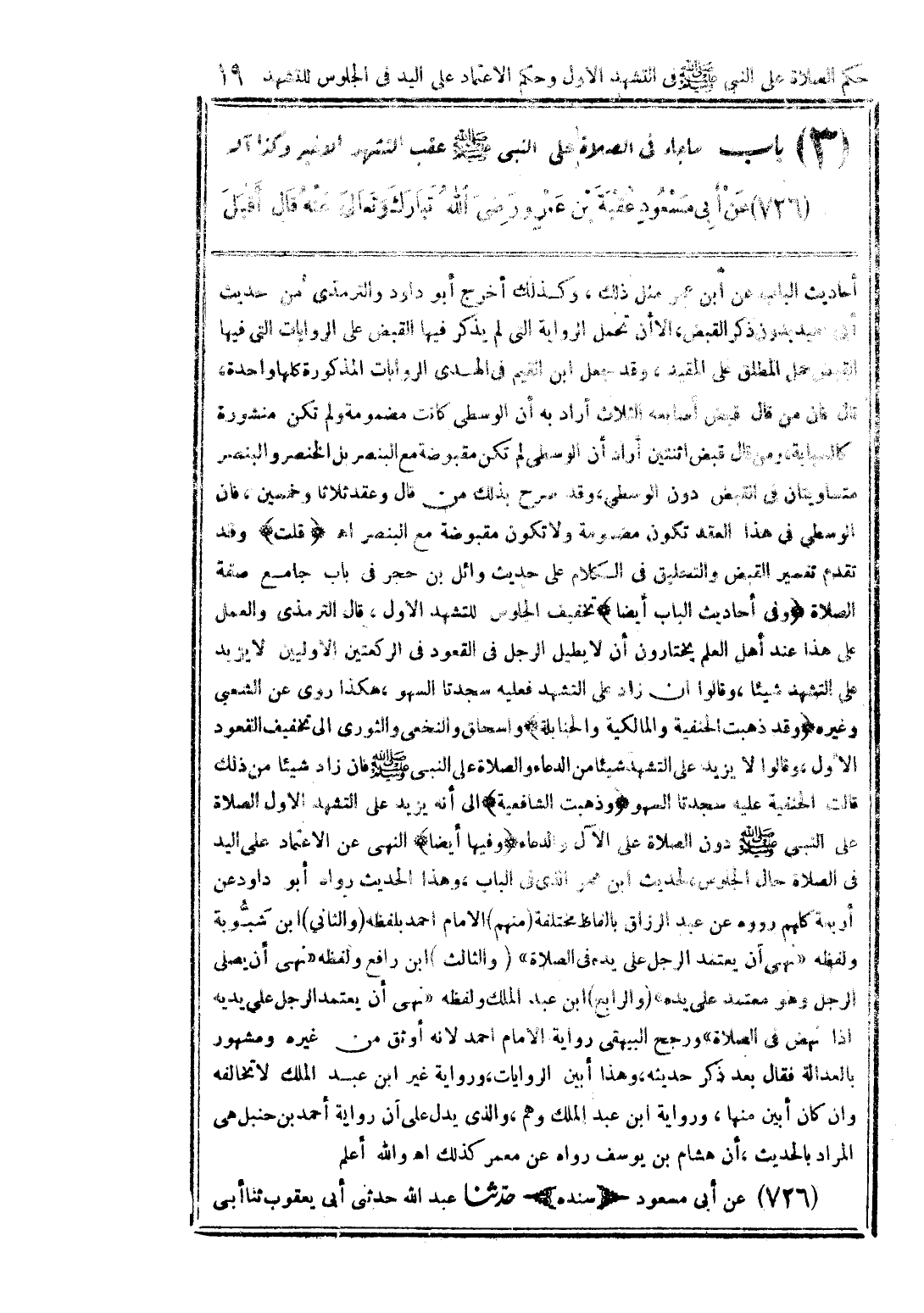 أحاديث الباب عن ابن عمر مثل ذلك، وكذلك أخرج أبو داود والترمذي من حديث أبي (...) بدون ذكر القبض، إلا أن تحمل الرواية التي لم يذكر فيها القبض على الروايات التي فيها القبض حمل المطلق على المقيد، وقد جعل ابن القيم في (الهدي) الروايات المذكورة كلها واحدة، قال: فإن من قال «قبض أصابعه الثلاث» أراد به أن الوسطى كانت مضمومة ولم تكن منشورة كالسبابة، ومن قال «قبض اثنتين» أراد أن الوسطى لم تكن مقبوضة مع البنصر بل الخنصر والبنصر متساويتان في القبض دون الوسطى، وقد صرح بذلك من قال «وعقد ثلاثًا وخمسين»، فإن الوسطى في هذا العقد تكون مضمومة ولا تكون مقبوضة مع البنصر. اهـ. قلت: وقد تقدم تفسير القبض والتعليق في الكلام على حديث وائل بن حجر في باب جامع صفة الصلاة. وفي أحاديث الباب أيضًا تخفيف الجلوس للتشهد الأول، قال الترمذي: والعمل على هذا عند أهل العلم يختارون أن لا يطيل الرجل في القعود في الركعتين الأوليين لا يزيد على التشهد شيئًا، وقالوا: إن زاد على التشهد فعليه سجدتا السهو، هكذا روي عن الشعبي وغيره. وقد ذهبت الحنيفية والمالكية والحنابلة وإسحاق والنخعي والثوري إلى تخفيف القعود الأول، وقالوا: لا يزيد على التشهد شيئًا من الدعاء والصلاة على النبي صلى الله عليه وسلم، فإن زاد شيئًا من ذلك قالت الحنفية: عليه سجدتا السهو. وذهبت الشافعية إلى أنه يزيد على التشهد الأول الصلاة على النبي صلى الله عليه وسلم دون الصلاة على الآل والدعاء. وفيها أيضًا النهي عن الاعتماد على اليد في الصلاة حال الجلوس، لحديث ابن عمر الذي في الباب، وهذا الحديث رواه أبو داود عن أربعة كلهم رووه عن عبد الرزاق بألفاظ مختلفة، منهم الإمام أحمد بلفظه، والثاني ابن شَبُّوبة ولفظه «نهى أن يعتمد الرجل على يده في الصلاة»، والثالث ابن رافع ولفظه «نهى أن يصلي الرجل وهو معتمد على يده»، والرابع ابن عبد الملك ولفظه «نهى أن يعتمد الرجل على يديه إذا نهض في الصلاة». ورجح البيهقي رواية الإمام أحمد لأنه أوثق من غيره ومشهور بالعدالة، فقال بعد ذكر حديثه: وهذا أبي الروايات، ورواية غير ابن عبد الملك لا تخالفه وإن كان أبين منها، ورواية ابن عبد الملك وهم، والذي يدل على أن رواية أحمد بن حنبل هي المراد بالحديث، أن هشام بن يوسف رواه عن معمر كذلك. اهـ. والله أعلم. 726 - عن أبي مسعود (سنده) حدثنا عبد الله حدثني أبي يعقوب ثنا أبي