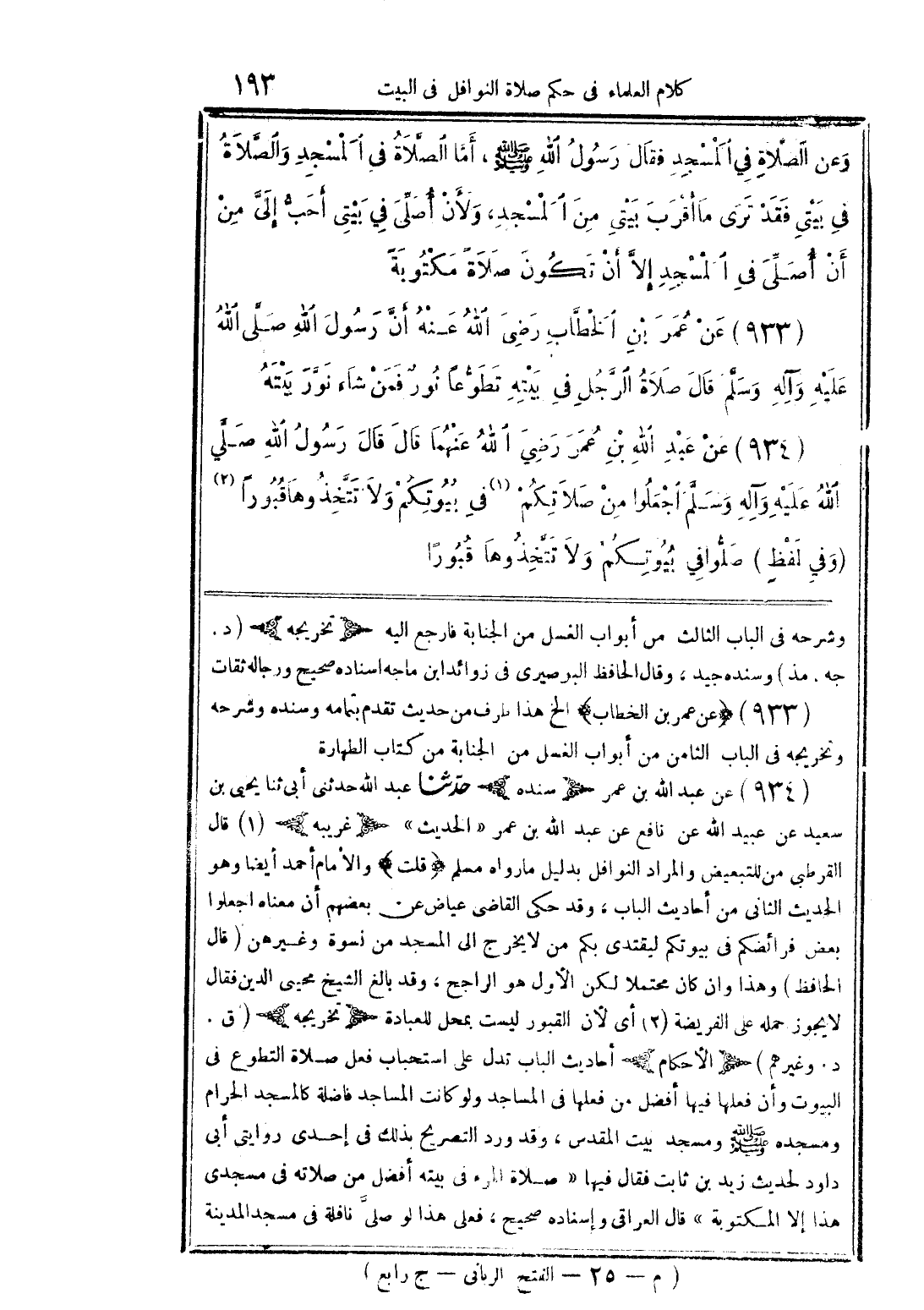 وعن الصلاة في المسجد فقال رسول الله صلى الله عليه وسلم: أما الصلاة في المسجد والصلاة في بيتي فقد ترى ما أقرب بيتي من المسجد، ولأن أصلي في بيتي أحب إلي من أن أصلي في المسجد إلا أن تكون صلاة مكتوبة. 933 - عن عمر بن الخطاب رضي الله عنه أن رسول الله صلى الله عليه وآله وسلم قال: صلاة الرجل في بيته تطوعًا نور فمن شاء نور بيته. 934 - عن عبد الله بن عمر رضي الله عنهما قال: قال رسول الله صلى الله عليه وآله وسلم: اجعلوا من صلاتكم (1) في بيوتكم ولا تتخذوها قبورًا (2) (وفي لفظ «صلوا في بيوتكم ولا تتخذوها قبورًا»).
