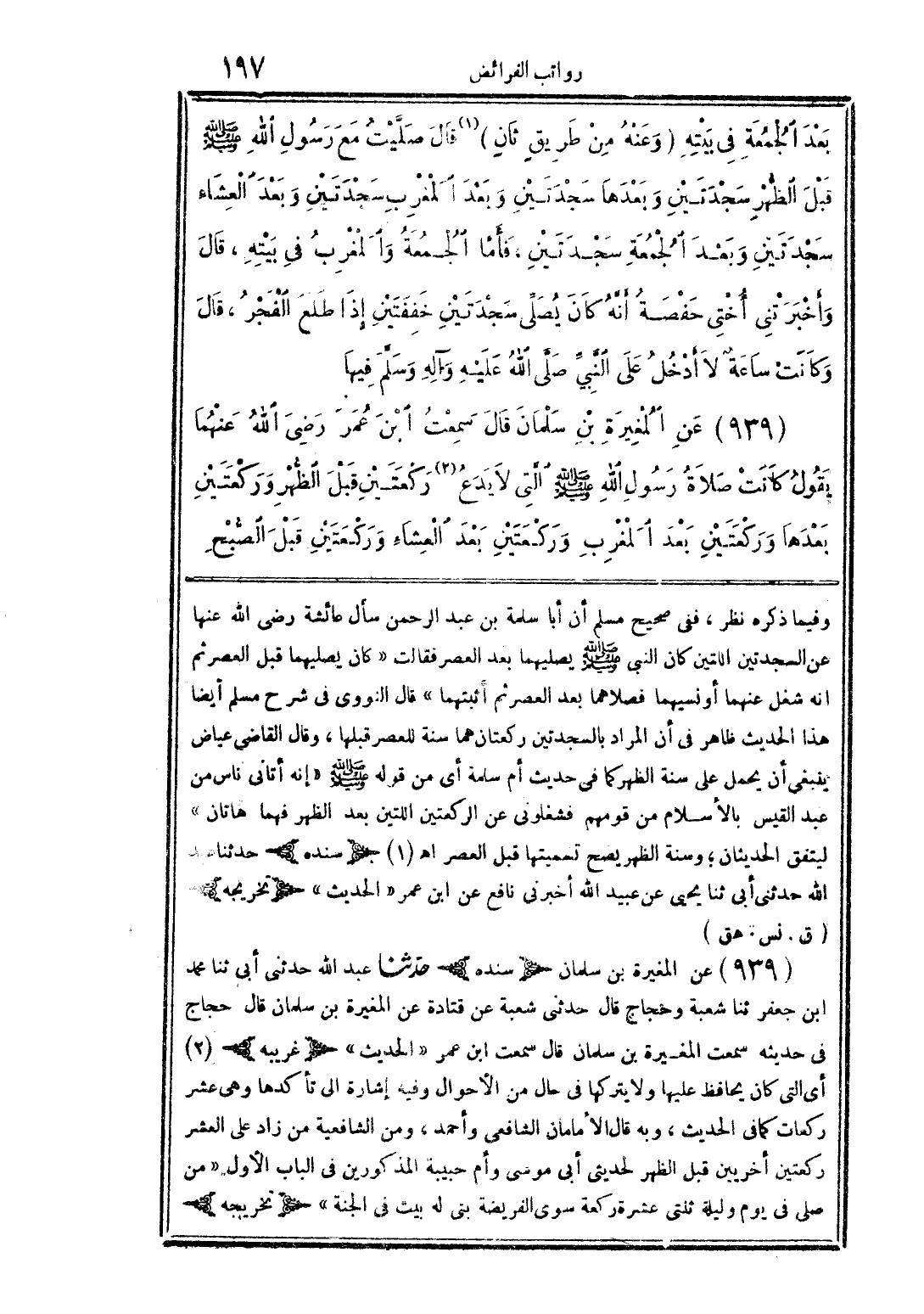 وفيما ذكره نظر، ففي (صحيح مسلم) أن أبا سلمة بن عبد الرحمن سأل عائشة رضي الله عنها عن السجدتين اللتين كان النبي صلى الله عليه وسلم يصليهما بعد العصر فقالت: «كان يصليهما قبل العصر ثم إنه شغل عنهما أو نسيهما فصلاهما بعد العصر ثم أثبتهما» قال النووي في (شرح مسلم) أيضًا: هذا الحديث ظاهر في أن المراد بالسجدتين ركعتان هما سنة للعصر قبلها، وقال القاضي عياض: ينبغي أن يحمل على سنة الظهر كما في حديث أم سلمة أي من قوله صلى الله عليه وسلم «إنه أتاني ناس من عبد القيس بالإسلام من قومهم فشغلوني عن الركعتين اللتين بعد الظهر فهما هاتان» ليتفق الحديثان، وسنة الظهر يصح تسميتها قبل العصر. اهـ. (سنده) 1 - حدثنا عبد الله حدثني أبي ثنا يحيى عن عبيد الله أخبرني نافع عن ابن عمر (الحديث). (تخريجه) (ق. نس. هق). 939 - عن المغيرة بن سلمان (سنده) حدثنا عبد الله حدثني أبي ثنا محمد بن جعفر ثنا شعبة وحجاج قال حدثني شعبة عن قتادة عن المغيرة بن سلمان قال حجاج في حديثه سمعت المغيرة بن سلمان قال سمعت ابن عمر (الحديث). (غريبه) 2 - أي التي كان يحافظ عليها ولا يتركها في حال من الأحوال وفيه إشارة إلى تأكدها وهي عشر ركعات كما في الحديث، وبه قال الإمامان الشافعي وأحمد، ومن الشافعية من زاد على العشر ركعتين أخريين قبل الظهر لحديثي أبي موسى وأم حبيبة المذكورين في الباب الأول «من صلى في يوم وليلة ثنتي عشرة ركعة سوى الفريضة بني له بيت في الجنة». (تخريجه)