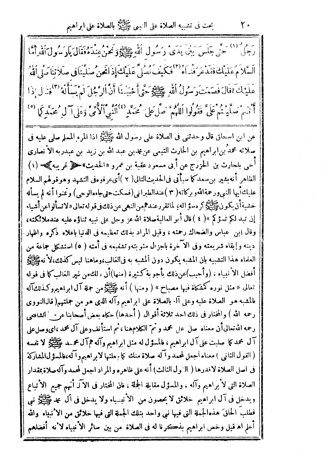 رجل (1) حتى جلس بين يدي رسول الله صلى الله عليه وسلم ونحن عنده فقال: يا رسول الله أما السلام عليك فقد عرفناه (2) فكيف نصلي عليك إذا نحن صلينا في صلاتنا صلى الله عليك؟ قال: فصمت رسول الله صلى الله عليه وسلم حتى أحببنا أن الرجل لم يسأله (3) فقال: إذا أنتم صليتم عليّ فقولوا: اللهم صل على محمد (4) النبي الأمي وعلى آل محمد كما (5)