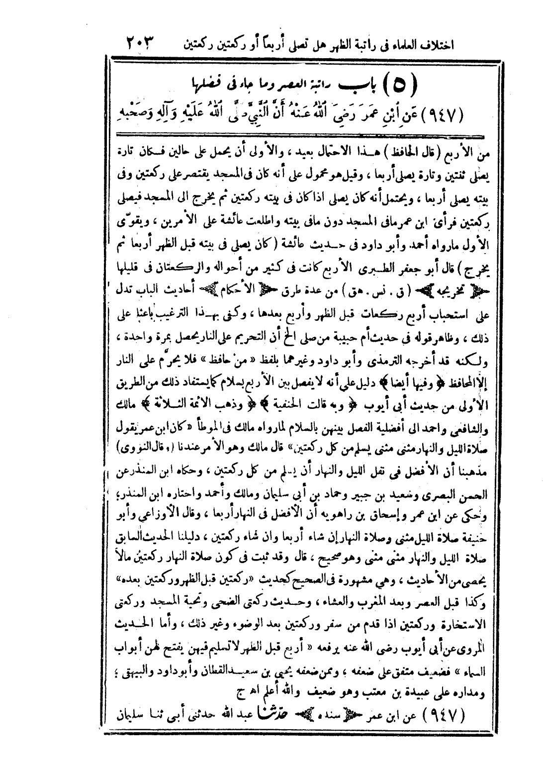 5 - باب راتبة العصر وما جاء في فضلها 947 - عن ابن عمر رضي الله عنه أن النبي صلى الله عليه وآله وصحبه