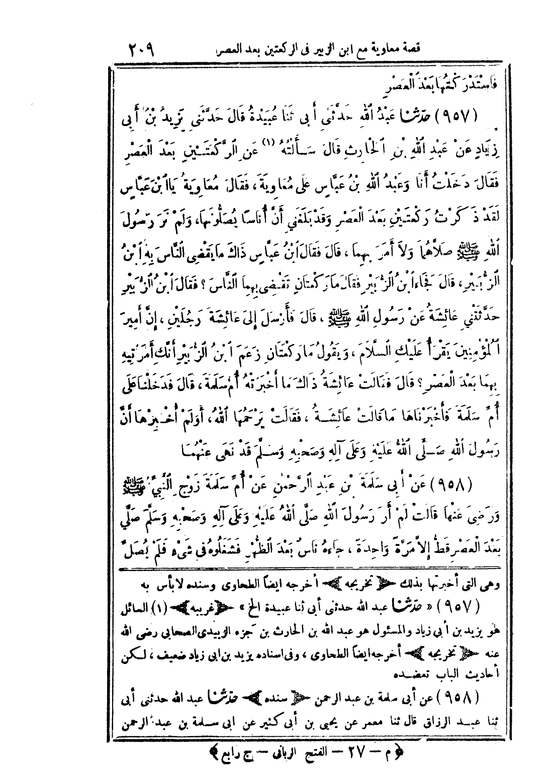 وهي التي أخبرتها بذلك. (تخريجه) أخرجه أيضًا الطحاوي وسنده لا بأس به. 957 - حدثنا عبد الله حدثني أبي ثنا عبيدة الخ. (غريبه) 1 - السائل هو يزيد بن أبي زياد والمسئول هو عبد الله بن الحارث بن جزء الزبيدي الصحابي رضي الله عنه. (تخريجه) أخرجه أيضًا الطحاوي، وفي إسناده يزيد بن أبي زياد ضعيف، لكن أحاديث الباب تعضده. 958 - عن أبي سلمة بن عبد الرحمن (سنده) حدثنا عبد الله حدثني أبي ثنا عبد الرزاق قال ثنا معمر عن يحيى بن أبي كثير عن أبي سلمة بن عبد الرحمن