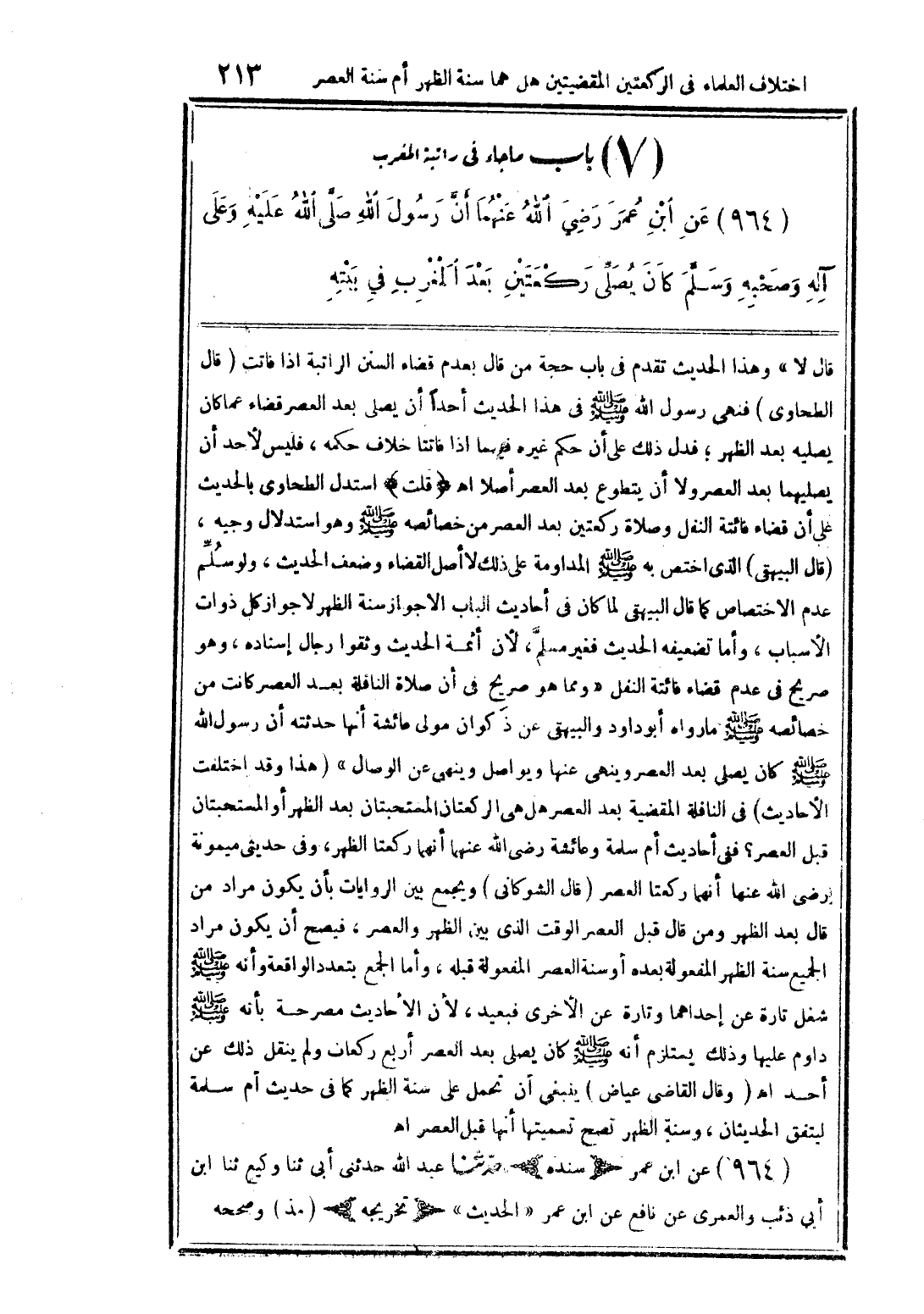 (964) عن ابن عمر رضى الله عنهما أنَّ رسول الله صلَّى الله عليه وعلى آله وصحبه وسلَّم كان يصلِّى ركعتين بعد المغرب في بيته