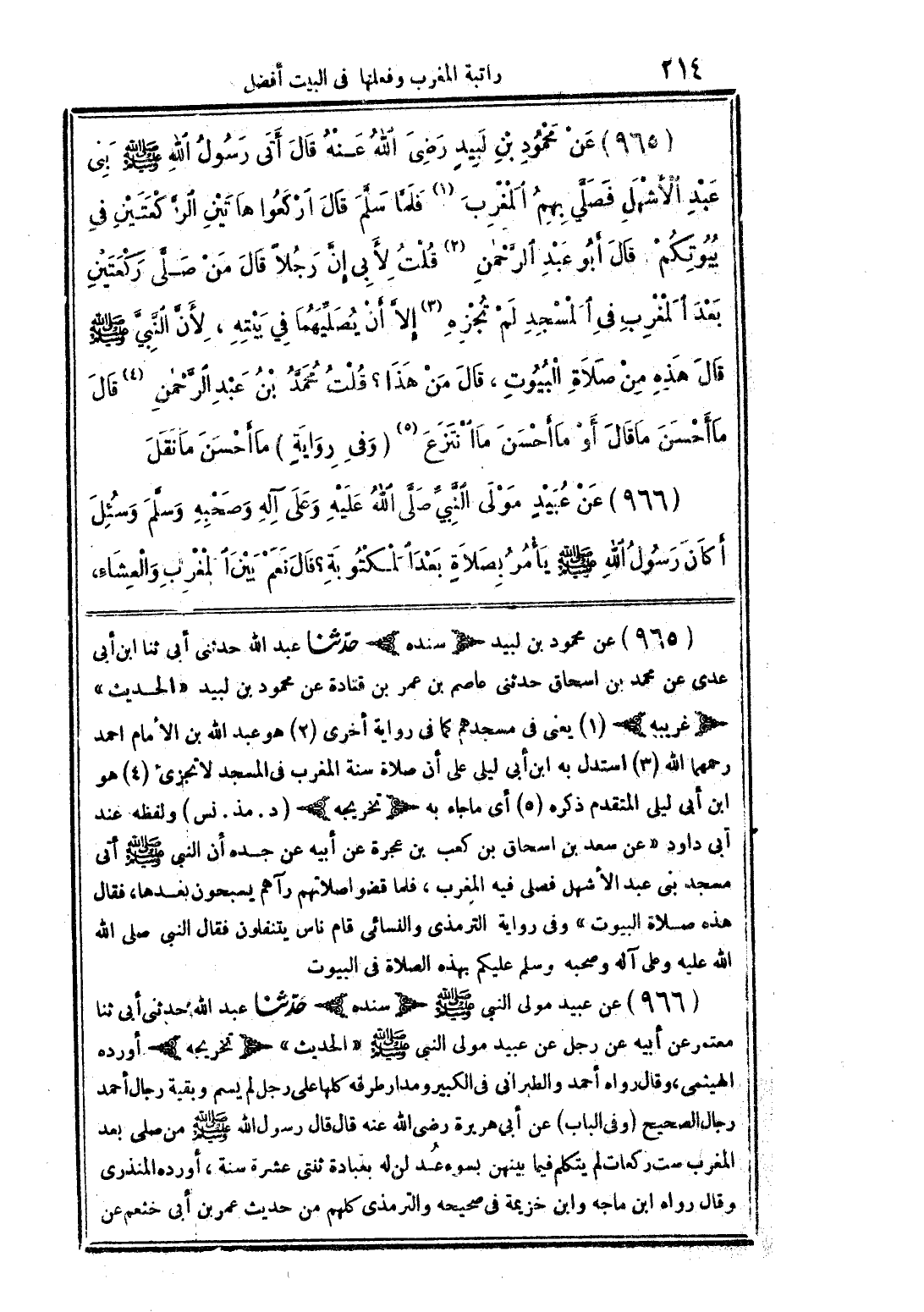 (965) عن محمود بن لبيد رضى الله عنه قال أتى رسول الله صلى الله عليه وسلم بنى عبد الأشهل فصلَّى بهم المغرب (1) فلمَّا سلَّم قال اركعوا هاتين الرَّكعتين فى بيوتكم قال أبو عبد الرَّحمن (2) قلت لأبى إنَّ رجلًا قال من صلَّى ركعتين بعد المغرب فى المسجد لم تجزه (3) إلَّا أن يصلِّيهما فى بيته، لأنَّ النَّبيَّ صلى الله عليه وسلم قال هذه من صلاة البيوت، قال من هذا؟ قلت محمَّد بن عبد الرَّحمن (4) قال ما أحسن ما قال أو ما أحسن ما انتزع (5) (وفى روايةٍ) ما أحسن ما نقل