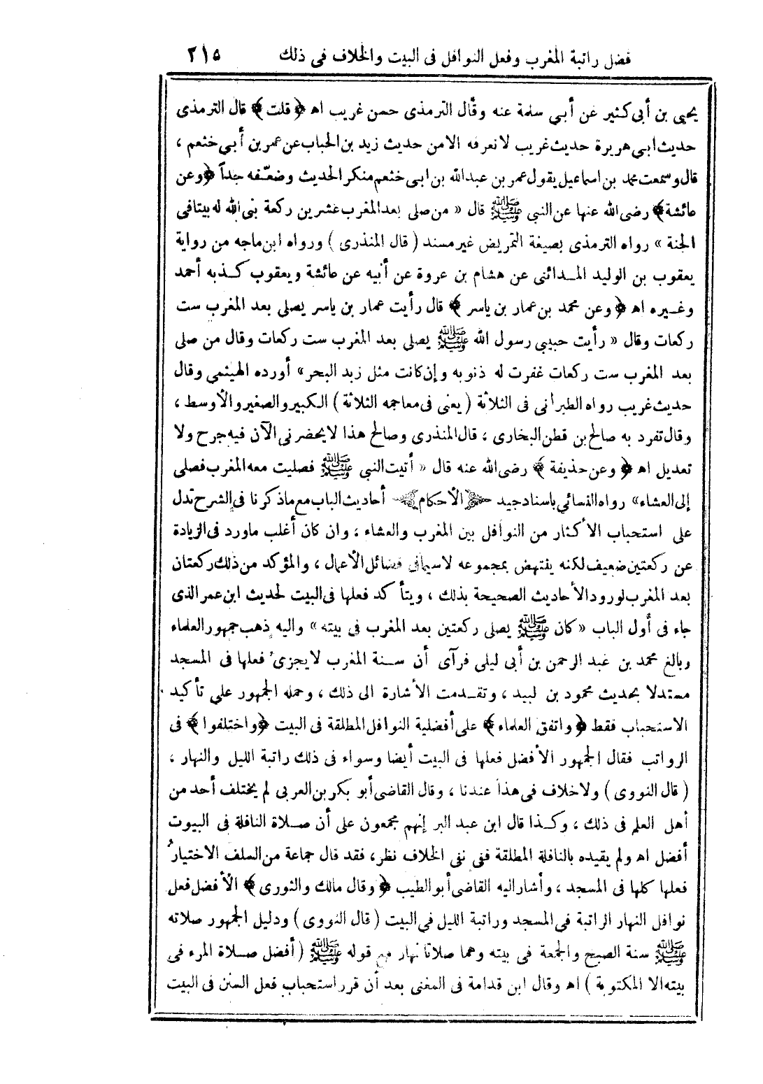 يحيى بن أبي كثير عن أبى سلمة عنه وقال الترمذى حسن غريب اهـ (قلت) قال الترمذى حديث ابى هريرة حديث غريب لا نعرفه الا من حديث زيد بن الحباب عن عمر بن أبى خثعم، قال وسمعت محمد بن اسماعيل يقول عمر بن عبد الله بن ابى خثعم منكر الحديث وضعّفه جدًا (وعن عائشة) رضى الله عنها عن النبى صلى الله عليه وسلم قال "من صلى بعد المغرب عشرين ركعة بنى الله له بيتا فى الجنة" رواه الترمذى بصيغة التمريض غير مسند (قال المنذرى) ورواه ابن ماجه من رواية يعقوب بن الوليد المدائنى عن هشام بن عروة عن أبيه عن عائشة ويعقوب كذبه أحمد وغيره اهـ (وعن محمد بن عمار بن ياسر) قال رأيت عمار بن ياسر يصلى بعد المغرب ست ركعات وقال "رأيت حبيبى رسول الله صلى الله عليه وسلم يصلى بعد المغرب ست ركعات وقال من صلى بعد المغرب ست ركعات غفرت له ذنوبه وإن كانت مثل زبد البحر" أورده الهيثمى وقال حديث غريب رواه الطبرانى فى الثلاثة (يعنى فى معاجمه الثلاثة) الكبير والصغير والأوسط، وقاقل تفرد به صالح بن قطن البخارى، قال المنذرى وصالح هذا لا يحضرنى الآن فيه جرح ولا تعديل اهـ (وعن حذيفة) رضى الله عنه قال "أتبت النبى صلى الله عليه وسلم فصليت معه المغرب فصلى إلى العشاء" رواه النسائي باسناد جيد (الأحكام) أحاديث الباب مع ما ذكرنا فى الشرح تدل على استحباب الأكثار من النوافل بين المغرب والعشاء، وان كان أغلب ما ورد فى الزيادة عن ركعتين ضعيف لكنه ينتهض بمجموعه لا سيما فى فضائل الأعمال، والمؤكد من ذلك ركعتان بعد المغرب لورود الأحاديث الصحيحة بذلك، ويتأكد فعلها فى البيت لحديث ابن عمر الذى جاء فى أول الباب "كان صلى الله عليه وسلم يصلى ركعتين بعد المغرب فى بيته" واليه ذهب جمهور العلماء وبالغ محمد بن عبد الرحمن بن أبى ليلى فرآى أن سنة المغرب لا يجزئ فعلها فى المسجد مستدلا بحديث محمود بن لبيد، وتقدمت الأشارة الى ذلك، وحمله الجمهور على تأكيد الاستحباب فقط (واتفق العلماء) على أفضلية النوافل المطلقة فى البيت (واختلفوا) فى الرواتب فقال الجمهور الأفضل فعلها فى البيت أيضا وسواء فى ذلك راتبة الليل والنهار، (قال النووي) ولا خلاف فى هذا عندنا، وقال القاضى أبو بكر بن العربى لم يختلف أحد من أهل العلم فى ذلك، وكذا قال ابن عبد البر إنهم مجمعون على أن صلاة النافلة فى البيوت أفضل اهـ ولم يقيده بالنافلة المطلقة ففى نفى الخلاف نظر، فقد قال حماعة من السلف الاختيار فعلها كلها فى المسجد، وأشار اليه القاضى أبو الطيب (وقال مالك والنووى) الأفضل فعل نوافل النهار الراتبة فى المسجد وراتبة الليل فى البيت (قال النووى) ودليل الجمهور صلاته صلى الله عليه وسلم سنة الصبح والجمعة فى بيته وهما صلاتا نهار مع قوله صلى الله عليه وسلم (أفضل صلاة المرء فى بيته الا المكتوبة) اهـ وقال ابن قدامة فى المغنى بعد أن قرر استحباب فعل السنن في البيت