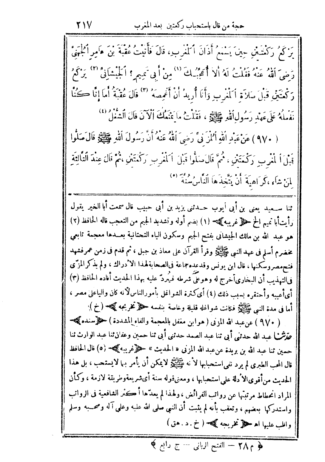 (970) عن عبد الله المزنىِّ رضى الله عنه أنَّ رسول الله صلى الله عليه وسلم قال صلُّوا قبل المغرب ركعتين، ثمَّ قال صلُّوا قبل المغرب ركعتين، ثمَّ قال عند الثَّالثة لمن شاء، كراهية أن يتَّخذها النَّاس سنَّةً (5)