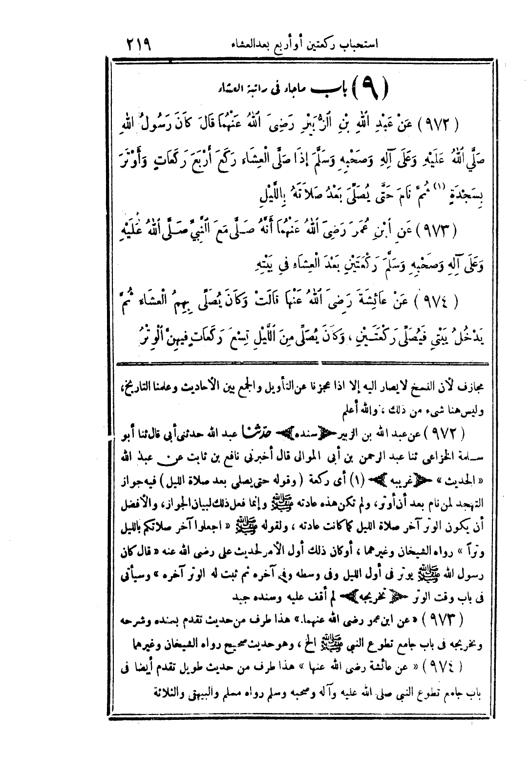 (973) عن ابن عمر رضى الله عنهما أنَّه صلَّى مع النَّبيِّ صلَّى الله عليه وعلى آله وصحبه وسلَّم ركعتين بعد العشاء فى بيته