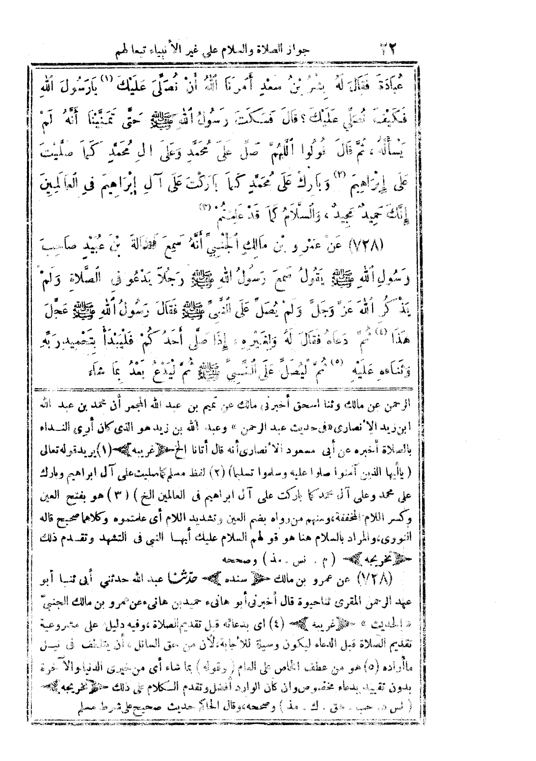 الرحمن عن مالك وثنا إسحاق أخبرني مالك عن تميم بن عبد الله المجمر أن محمد بن عبد الله بن زيد الأنصاري (في حديث عبد الرحمن). وعبد الله بن زيد هو الذي كان أري النداء بالصلاة أخبره عن أبي مسعود الأنصاري أنه قال: أتانا الخ. (غريبه) 1 - يريد قوله تعالى: {يَا أَيُّهَا الَّذِينَ آمَنُوا صَلُّوا عَلَيْهِ وَسَلِّمُوا تَسْلِيمًا} (الأحزاب 56). 2 - لفظ مسلم «كما صليت على آل إبراهيم وبارك على محمد وعلى آل محمد كما باركت على آل إبراهيم في العالمين» الخ. 3 - هو بفتح العين وكسر اللام المخففة، ومنهم من رواه بضم العين وتشديد اللام، أي علمتموه، وكلاهما صحيح. قاله النووي. والمراد بالسلام هنا هو قولهم «السلام عليك أيها النبي» في التشهد، وتقدم ذلك. (تخريجه) (م. نس. مذ) وصححه.