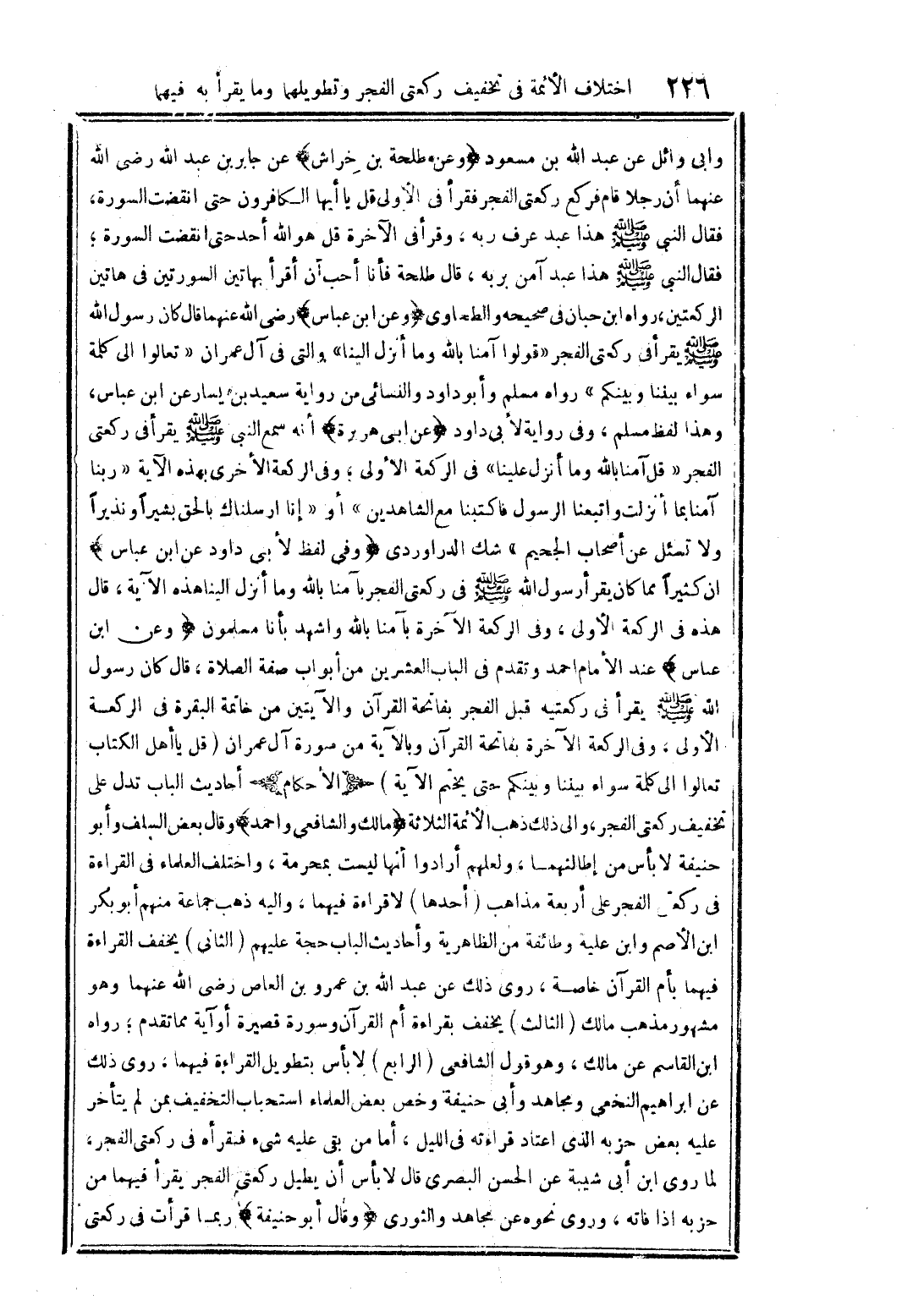 وأبي وائل عن عبد الله بن مسعود (وعن طلحة بن خراش) عن جابر عبد الله رضى الله عنهما أن رجلا قام فركع ركعتى الفجر فقرأ فى الأولى قل يا أيها الكافرون حتى انقضت السورة، فقال النبى صلى الله عليه وسلم هذا عبد عرف ربه، وقرأ فى الآخرة قل هو الله أحد حتى انقضت السورة؛ فقال النبى صلى الله عليه وسلم هذا عبد آمن بربه، قال طلحة فأنا أحب أن أقرأ بهاتين السورتين فى هاتين الركعتين، رواه ابن حبان فى صحيحه والطحاوى (وعن ابن عباس) رضى الله عنهما قال كان رسول الله صلى الله عليه وسلم يقرأ فى ركعتى الفجر {قولوا آمنا بالله وما أنزل الينا} والتى فى آل عمران {تعالوا الى كلمة سواء بيننا وبينكم} رواه مسلم وأبو داود والنسائى من رواية سعيد بن يسار عن ابن عباس، وهذا لفظ مسلم، وفى رواية لأبى داود (عن ابى هريرة) أنه سمع النبى صلى الله عليه وسلم يقرأ فى ركعتى الفجر {قل آمنا بالله وما أنزل علينا} فى الركعة الأولى؛ وفى الركعة الأخرى بهذه الآية {ربنا آمنا بما أنزلت واتبعنا الرسول فاكتبنا مع الشاهدين} أو {إنا ارسلناك بالحق بشيرًا ونذيرًا ولا تسئل عن أصحاب الجحيم} شك الدراوردى (وفى لفظ لأبى داود عن ابن عباس) ان كثيرًا مما كان يقرأ رسول الله صلى الله عليه وسلم فى ركعتى الفجر بآمنا بالله وما أنزل الينا هذه الآية، قال هذه فى الركعة الأولى، وفى الركعة الآخرة بآمنا بالله واشهد بأنا مسلمون (وعن ابن عباس) عند الأمام احمد وتقدم فى الباب العشرين من أبواب صفة الصلاة، قال كان رسول الله صلى الله عليه وسلم يقرأ فى ركعتيه قبل الفجر بفاتحة القرآن والآيتين من خاتمة البقرة فى الركعة الأولى. وفى الركعة الآخرة بفاتحة القرآن وبالآية من سورة آل عمران {قل يا أهل الكتاب تعالوا الى كلمة سواء بيننا وبينكم حتى يختم الآية} (الأحكام) أحاديث الباب تدل على تخفيف ركعتى الفجر، والى ذلك ذهب الأئمة الثلاثة (مالك والشافعى واحمد) وقال بعض السلف وأبو حنيفة لا بأس من إطالتهما، ولعلهم أرادوا أنها ليست بمحرمة، واختلف العلماء فى القراءة فى ركعتى الفجر على أربعة مذاهب (أحدها) لا قراءة فيهما، واليه ذهب جماعة منهم أبو بكر ابن الأصم وابن عليه وطائفة من الظاهرية وأحاديث الباب حجة عليهم (الثانى) يخفف القراءة فيهما بأم القرآن خاصة، روى ذلك عن عبد الله بن عمرو بن العاص رضى الله عنهما وهو مشهور مذهب مالك (الثالث) يخفف بقراءة أم القرآن وسورة قصيرة أو آية مما تقدم؛ رواه ابن القاسم عن مالك، وهو قلو الشافعى (الرابع) لا بأس بتطويل القراءة فيهما، روى ذلك عن ابراهيم النخعى ومجاهد وأبى حنيفة وخص بعض العلماء استحباب التخفيف بمن لم يتأخر عليه بعض حزبه الذى اعتاد قراءته فى الليل، أما من بقى عليه شئ فقرأه فى ركعتى الفجر، لما روى ابن شيبة عن الحسن البصرى قال لا بأس أن يطيل ركعتى الفجر يقرأ فيهما من حزبه اذا فاته، وروى نحوه عن مجاهد والثورى (وقال أبو حنيفة) ربما قرأت في ركعتي