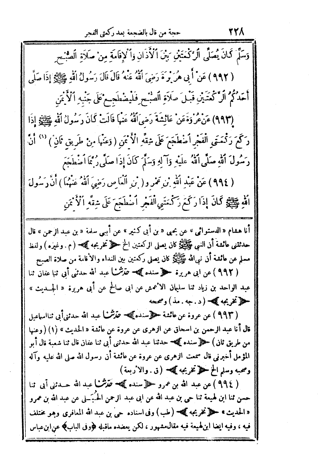 (993) عن عروة عن عائشة رضى الله عنها قالت كان رسول الله صلى الله عليه وسلم إذا ركع ركعتى الفجر اضطجع على شقِّه الأيمن (وعنها من طريقٍ ثانٍ) (1) أنَّ رسول الله صلَّى الله عليه وآله وسلَّم كان إذا صلَّى ربَّما اضطجع