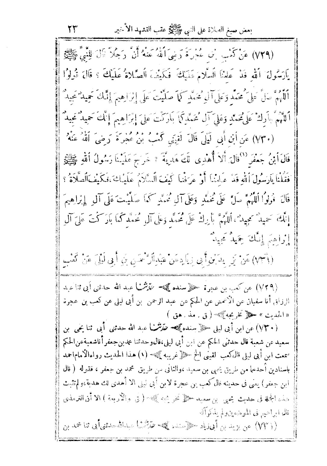 23 729 - عن كعب بن عجرة رضي الله عنه أن رجلاً قال للنبي صلى الله عليه وسلم: يا رسول الله قد علمنا السلام عليك فكيف الصلاة عليك؟ قال: قولوا: اللهم صل على محمد وعلى آل محمد كما صليت على إبراهيم إنك حميد مجيد، اللهم بارك على محمد وعلى آل محمد كما باركت على إبراهيم إنك حميد مجيد. 730 - عن ابن أبي ليلى قال: لقيني كعب بن عجرة رضي الله عنه قال ابن جعفر (1) قال: ألا أهدي لك هدية؟ خرج علينا رسول الله صلى الله عليه وسلم فقلنا: يا رسول الله قد علمنا أو عرفنا كيف السلام عليك، فكيف الصلاة؟ قال: قولوا: اللهم صل على محمد وعلى آل محمد كما صليت على آل إبراهيم إنك حميد مجيد، اللهم بارك على محمد وعلى آل محمد كما باركت على آل إبراهيم إنك حميد مجيد. 731 - عن يزيد بن أبي زياد عن عبد الرحمن بن أبي ليلى عن كعب