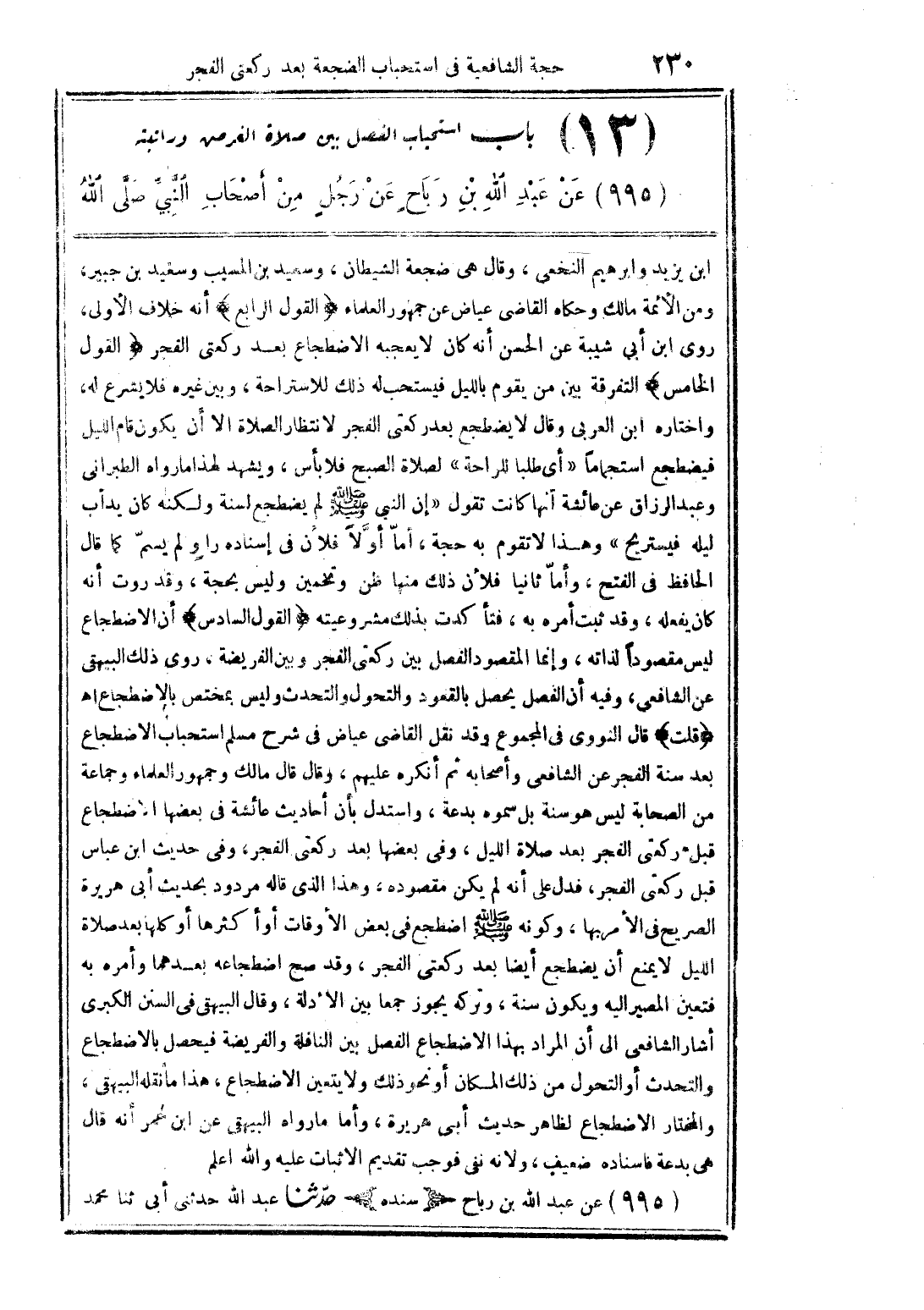 ابن يزيد وابراهيم النخعى، وقال هى ضجعة الشيطان، وسعيد بن المسيب وسعيد بن جبيرة، ومن الأئمة مالك وحكاه القاضى عياض عن جمهور العلماء (القول الرابع) أنه خلاف الأولى، روى ابن أبي شيبة عن الحسن أنه كان لا يعجبه الاضطجاع بعد ركعتى الفجر (القول الخامس) التفرقة بين من يقوم بالليل فيستحب له ذلك للاستراحة، وبين غيره فلا يشرع له، واختاره ابن العربى وقال لا يضطجع بعد ركعتى الفجر لانتظار الصلاة الا أن يكون قام الليل فيضطجع استجمامًا "أى طلبا للراحة" لصلاة الصبح فلا بأس، ويشهد لهذا ما رواه الطبرانى وعبد الرزاق عن عائشة أنها كانت تقول "إن النبى صلى الله عليه وسلم لم يضطجع لسنة ولكنه كان يدأب ليله فيستريح" وهذا لا تقوم به حجة، أمّا أوَّلًا فلان فلان فى إسناده راوٍ لم يسمّ كما قال الحافظ فى الفتح، وأمّا ثانيا فلأن ذلك منها ظن وتخمين وليس بحجة، وقد روت أنه كان يفعله، وقد ثبت أمره به، فتأكدت بذلك مشروعيته (القول السادس) أن الاضطجاع ليس مقصودًا لذاته، وإنما المقصود الفصل بين ركعتى الفجر وبين الفريضة، روى ذلك البيهقى عن الشافعى، وفيه أن الفصل يحصل بالقعود والتحول والتحدث وليس بمختص بالاضطجاع اهـ (قلت) قال النووى فى المجموع وقد نقل القاضى عياض فى شرح مسلم استحباب الاضطجاع بعد سنة الفجر عن الشافعى وأصحابه ثم أنكره عليهم، وقال قال مالك وجمهور العلماء وجماعة من الصحابة ليس هو سنة بل سموه بدعة، واستدل بأن أحاديث عائشة فى بعضها الاضطجاع قبل ركعتى الفجر بعد صلاة الليل، وفى بعضها بعد ركعتى الفجر، وفى حديث ابن عباس قبل ركعتى الفجر، فدل على أنه لم يكن مقصوده، وهذا الذى قاله مردود بحديث أبى هريرة الصريح فى الأمر بها، وكونه صلى الله عليه وسلم اضطجع فى بعض الأوقات أو أكثرها أو كلها بعد صلاة الليل لا يمنع أن يضطجع أيضا بعد ركعتى الفجر، وقد صح اضطجاعه بعدهما وأمره به فتعين المصير اليه ويكون سنة، وتركه يجوز جمعا بين الأدلة، وقال البيهقى فى السنن الكبرى أشار الشافعى الى أن المراد بهذا الاضطجاع الفصل بين النافلة والفريضة فيحصل بالاضطجاع والتحدث أو التحول من ذلك المكان أو نحو ذلك ولا يتعين الاضطجاع، هذا ما نقله البيهقى، والمختار الاضطجاع لظاهر حديث أبى هريرة، وأما ما رواه البيهقى عن ابن عمر أنه قال هى بدعة فاسناده ضعيف، ولانه نفى فوجب تقديم الاثبات عليه والله أعلم