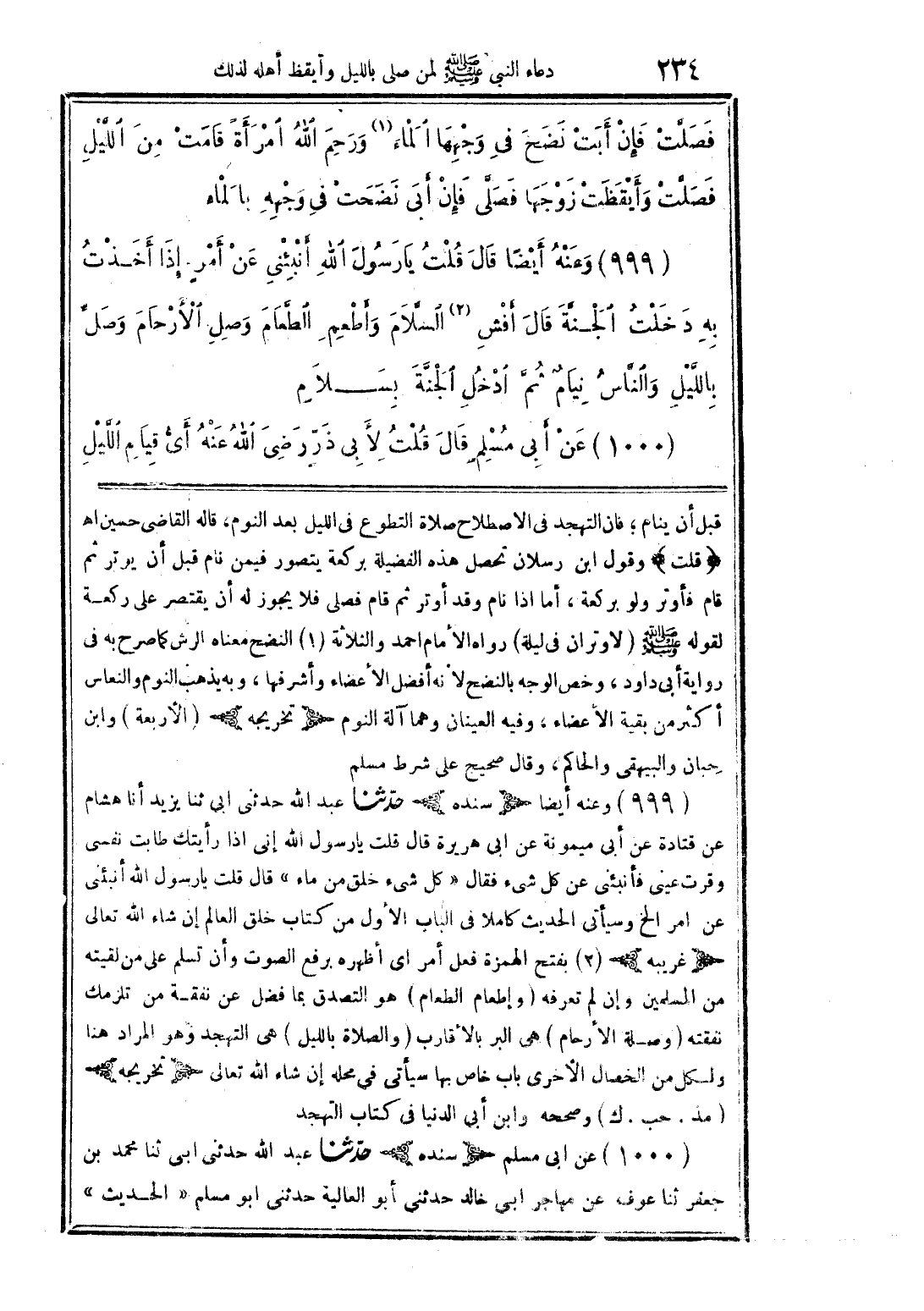 فصليت فإن أبت نضح في وجهها الماء (1) ورحم الله امرأة قامت من الليل فصلت وأيقظت زوجها فصلى فإن أبى نضحت في وجهه بالماء.