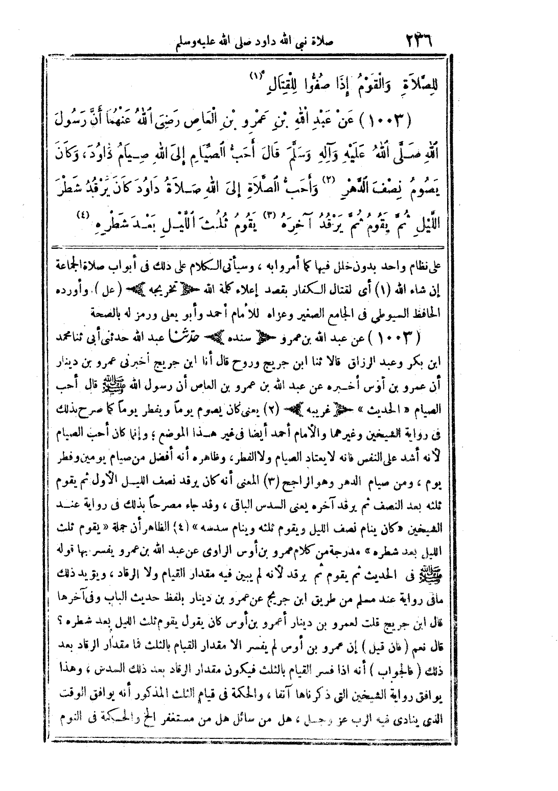 (1003) عن عبد الله بن عمرو بن العاص رضى الله عنهما أن رسول الله صلى الله عليه وآله وسلم قال أحب الصيام إلى الله صيام داود، وكان يصوم نصف الدهر (2) وأحب الصلاة إلى الله صلاة داود كان يرقد شطر الليل ثم يقوم ثم يرقد آخره (3) يقوم ثلث الليل بعد شطره (3)