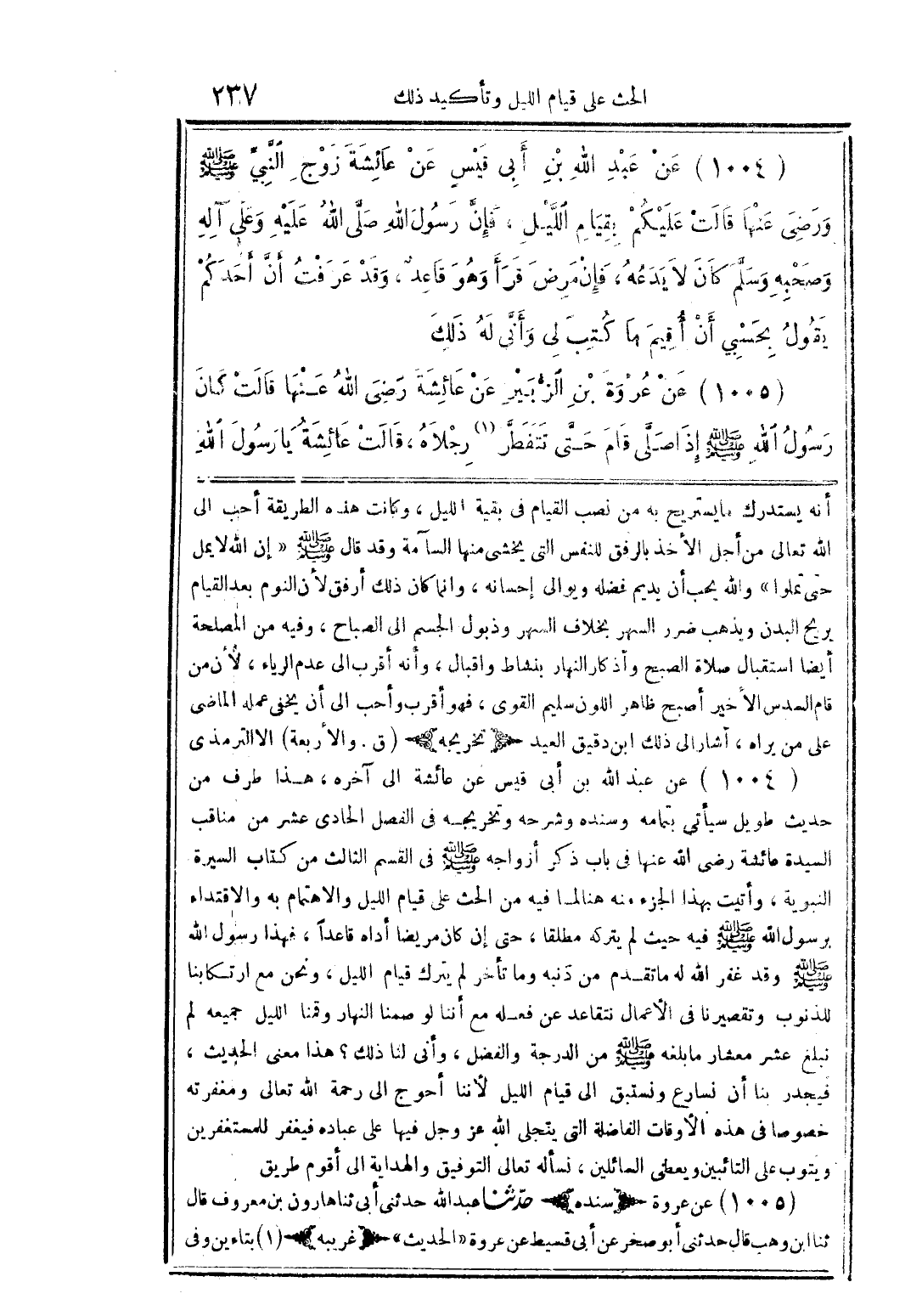 (1004) عن عبد الله بن أبي قيس عن عائشة إلى آخره، هذا طرف من حديث طويل سيأتي بتمامه وسنده وشرحه وتخريجه في الفصل الحادي عشر من مناقب السيدة عائشة رضى الله عنها في باب ذكر أزواجه صلى الله عليه وسلم في القسم الثالث من كتاب السيرة النبوية، وأتيت بهذا الجزء منه هنا لما فيه من الحث على قيام الليل والاهتمام به والاقتداء برسول الله صلى الله عليه وسلم فيه حيث لم يتركه مطلقًا، حتى إن كان مريضًا أداه قاعدًا، فهذا رسول الله صلى الله عليه وسلم وقد غفر الله له ما تقدم من ذنبه وما تأخر لم يترك قيام الليل، ونحن مع ارتكابنا للذنوب وتقصيرنا في الأعمال نتقاعد عن فعله مع أننا لو صمنا النهار وقمنا الليل جميعه لم نبلغ عشر معشار ما بلغه صلى الله عليه وسلم من الدرجة والفضل، وأنى لنا ذلك؟ هذا معنى الحديث، فيجدر بنا أن نسارع ونستبق إلى قيام الليل لأننا أحوج إلى رحمة الله تعالى ومغفرته خصوصًا في هذه الأوقات الفاضلة التي يتجلى الله عز وجل فيها على عباده فيغفر للمستغفرين ويتوب على التائبين ويعطى السائلين، نسأله تعالى التوفيق والهداية إلى أقوم طريق