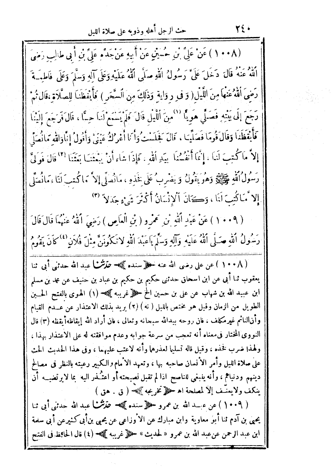 (1008) عن علي بن حسين عن أبيه عن جده على بن أبي طالب رضى الله عنه قال دخل على رسول الله صلى الله عليه وعلى آله وسلم وعلى فاطمة رضى الله عنها من الليل (وفي رواية وذلك من السحر) فأيقظنا للصلاة، قال ثم جع إلى بيته فصلى هويًا (1) من الليل قال فلم يسمع لنا حسًا، قال فرجع إلينا فأيقظنا وقال قومًا فصليا، قال فجلست وأنا أعرك عيني وأقول إنا والله ما نصلي إلا ما كتب لنا. إنما أنفسنا بيد الله. فإذا شاء أن يبعثنا بعثنا (2) قال فولى رسول الله صلى الله عليه وسلم وهو يقول ويضرب على فخذه، ما نصلى إلا ما كتب لنا، ما نصلى إلا ما كتب لنا، وكان الإنسان أكثر شيءٍ جدلًا (3)