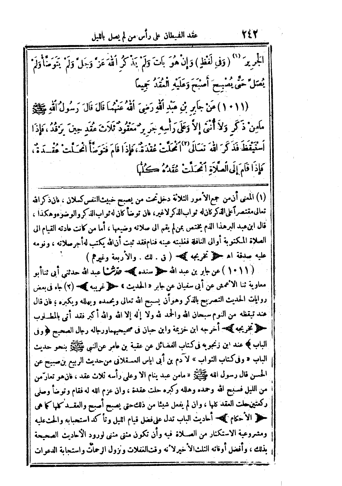 (1011) عن جابر بن عبد الله رضى الله عنهما قال قال رسول الله صلى الله عليه وسلم ما من ذكر ولا أنثى إلا وعلى رأسه جريرٌ معقودٌ ثلاث عقدٍ حين يرقد، فإذا استيقظ فذكر الله تعالى (2) انحلت عقدةٌ، فإذا قام فتوضأ انحلت عقدةٌ، فإذا قام إلى الصلاة انحلت عقده كلها