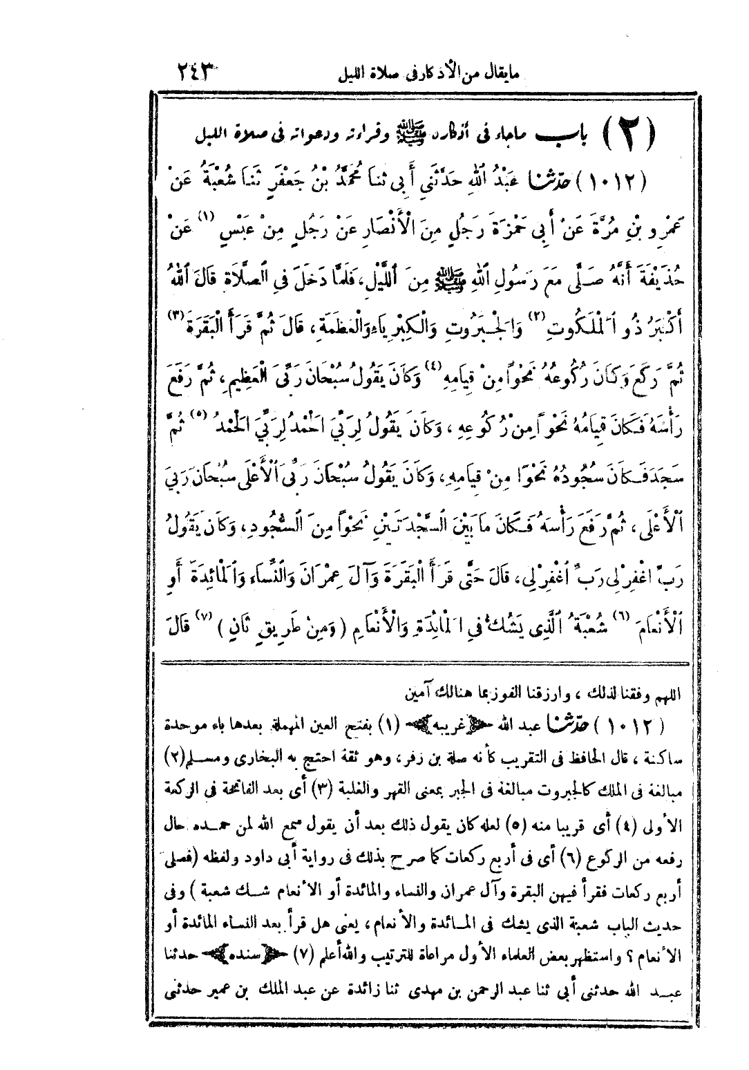 (1012) حدثنا عبد الله حدثني أبي ثنا محمد بن جعفرٍ ثنا شعبة عن عمرو بن مرة عن أبي حمزة رجلٍ من الأنصار عن رجلٍ من عبسٍ (1) عن حذيفة أنه صلى مع رسول الله صلى الله عليه وسلم من الليل، فلما دخل في الصلاة قال الله أكبر ذو الملكوت (2) والجبروت والكبرياء والعظمة، قال ثم قرأ البقرة (3) ثم ركع وكان ركوعه نحوًا من قيامه (4) وكان يقول سبحان ربي العظيم، ثم رفع رأسه فكان قيامه نحوًا من ركوعه، وكان يقول لربي أحمد لربي الحمد (5) ثم سجد فكان سجوده نحوًا من قيامه، وكان يقول سبحان ربي الأعلى سبحان ربي الأعلى، ثم رفع رأسه فكان ما بين السجدتين نحوًا من السجود، وكان يقول رب اغفر لي رب اغفر لي، قال حتى قرأ البقرة وآل عمران والنساء والمائدة أو الأنعام (6) شعبة الذي يشك في المائدة والأنعام (ومن طريق ثانٍ) (7) قال