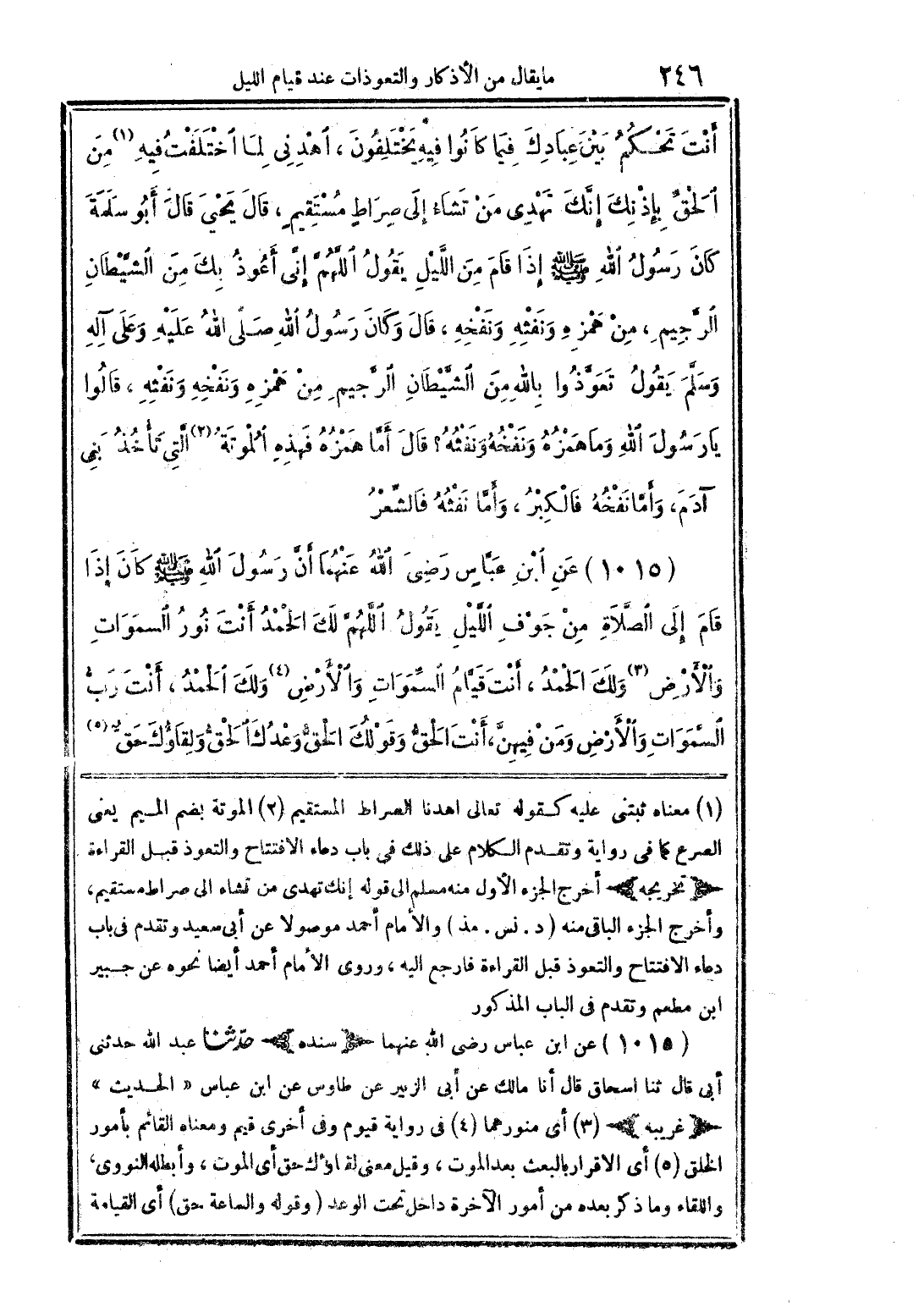(1015) عن ابن عباس رضى الله عنهما أن رسول الله صلى الله عليه وسلم كان إذا قام إلى الصلاة من جوف الليل يقول اللهم لك الحمد أنت نور السموات والأرض (3) ولك الحمد، أنت قيام السموات والأرض (4) ولك الحمد، أنت رب السموات والأرض ومن فيهن، أنت الحق وقولك الحق وعدك الحق ولقاؤك حق (5)