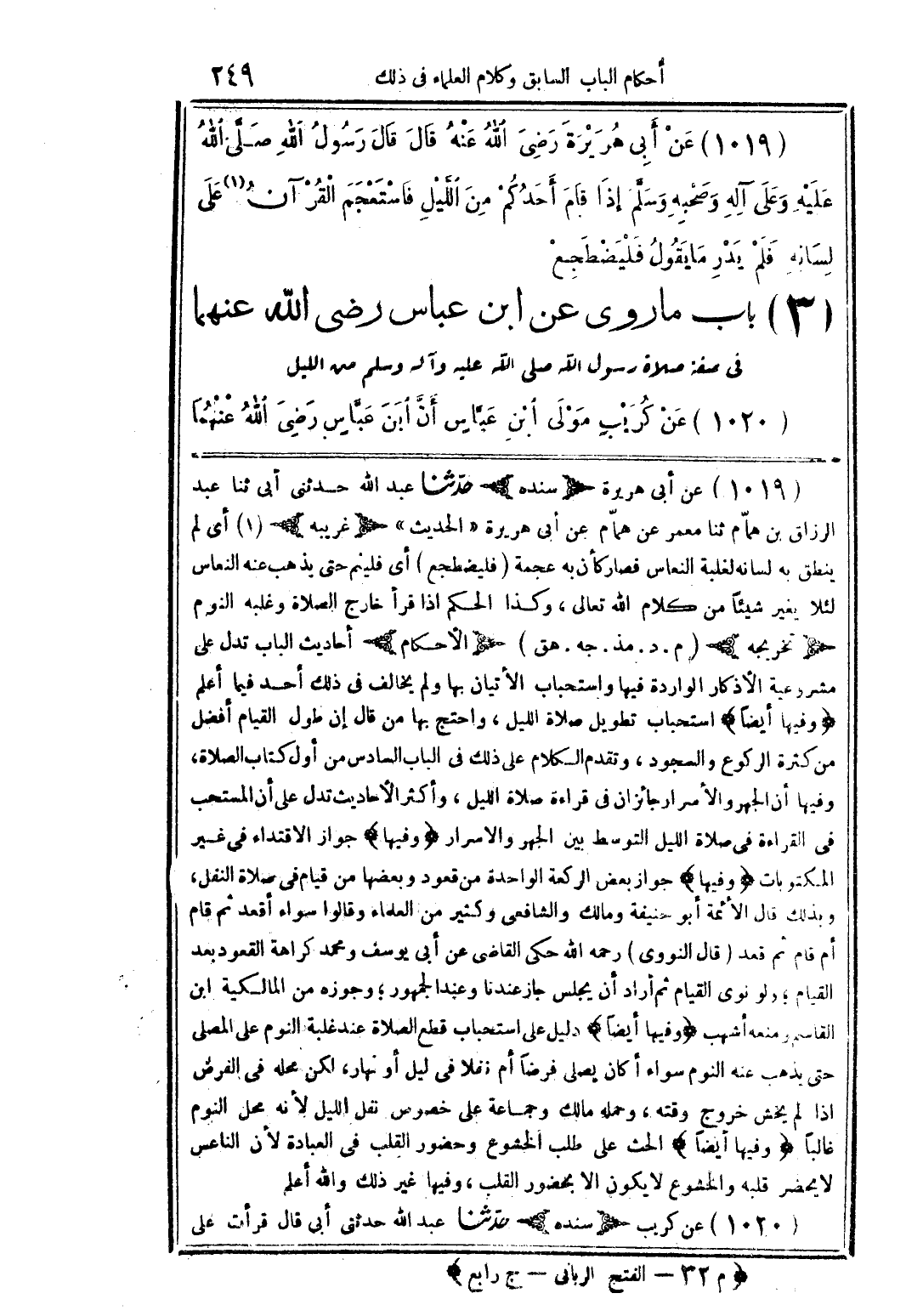 (1019) عن أبي هريرة (سنده) حدثنا عبد الله حدثني أبي ثنا عبد الرزاق بن همام ثنا معمر عن همام عن أبي هريرة "الحديث" (غريبه) (1) أي ينطق به لسانه لغلبة النعاس فصار كأن به عجمة (فليضطجع) أي فليتم حتى يذهب عنه النعاس لئلا يغير شيئًا من كلام الله تعالى، وكذا الحكم إذا قرأ خارج الصلاة وغلبه النوم (تخريجه) (م. د. مذ. جه. هق) (الأحكام) أحاديث الباب تدل على مشرعية الأذكار الواردة فيها واستحباب الأتيان بها ولم يخالف في ذلك أحدٍ فيما أعلم (وفيها أيضًا) استحباب تطويل صلاة الليل، واحتج بها من قال إن طول القيام أفضل من كثرة الركوع والسجود، وتقدم الكلام على ذلك في الباب السادس من أول كتاب الصلاة، وفيها أن الجهر والإسرار جائزان في قراءة صلاة الليل، وأكثر الأحاديث تدل على أن المستحب في القراءة في صلاة الليل التوسط بين الجهر والإسرار (وفيها) جواز الاقتداء في غير المكتوبات (وفيها) جواز بعض الركعة الواحدة من قعود وبعضها من قيام في صلاة النفل، وبذلك قال الأئمة أبو حنيفة ومالك والشافعي وكثير من العلماء وقالوا سواء أقعد ثم قام أم قام ثم قعد (قال النووي) رحمه الله حكى القاضي عن أبي يوسف ومحمد كراهة القعود بعد القيام؛ ولو نرى القيام ثم أراد أن يجلس جاز عندنا وعند الجمهور؛ وجوزه من المالكية ابن القاسم ومنعه أشهب (وفيها أيضًا) دليل على استحباب قطع الصلاة عند غلبة النوم على المصلى حتى يذهب عنه النوم سواء أكان يصلى فرضًا أم نفلًا في ليل أو نهار، لكن محله في الفرض إذا لم يخش خروج وقته، وحمله مالك وجماعة على خصوص نفل الليل لأنه محل النوم غالبًا (وفيها أيضًا) الحث على طلب الخشوع وحضور القلب في العبادة لأن الناعس لا يحضر قلبه والخشوع لا يكون إلا بحضور القلب، وفيها غير ذلك والله أعلم