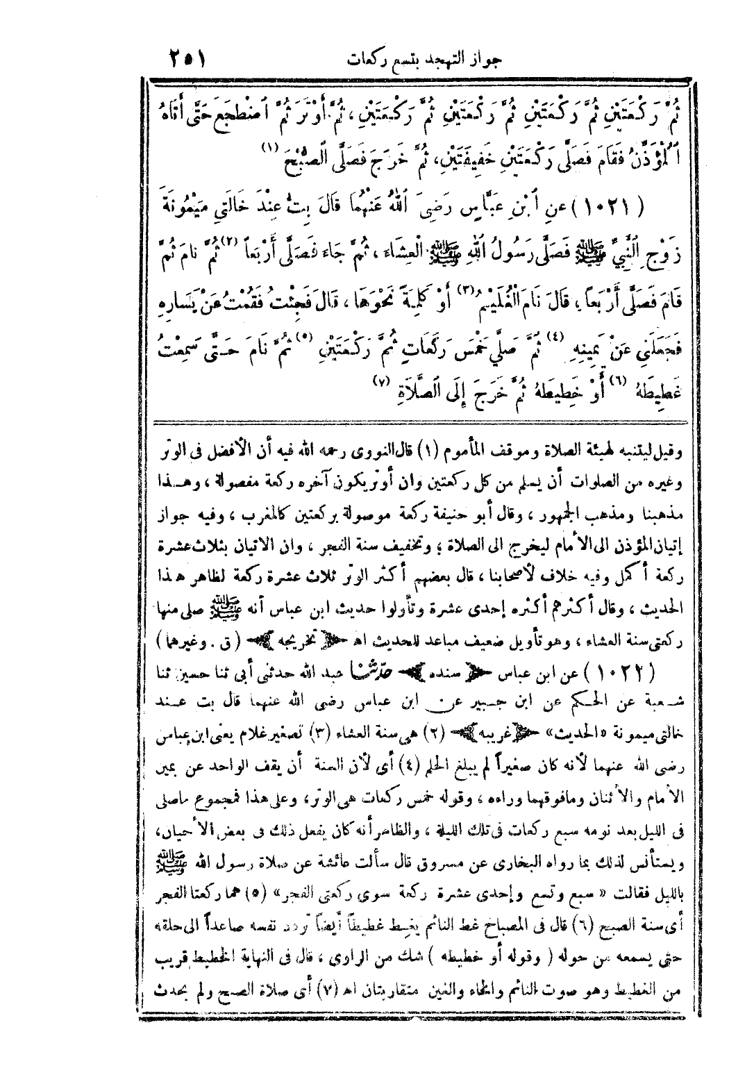 (1021) عن ابن عباس (سنده) حدثنا عبد الله حدثني أبي ثنا حسين ثنا شعبة عن الحكم عن ابن جبير عن ابن عباس رضى الله عنهما قال بت عند خالتي ميمونة "الحديث" (غريبه) (2) هي سنة العشاء (3) تصغير غلام يعني ابن عباس رضى الله عنهما لأنه كان صغيرًا لم يبلغ الحلم (4) أي لأن السنة أن يقف الواحد عن يمين الإمام والاثنان وما فوقهما وراءه، وقوله خمس ركعات هي الوتر، وعلى هذا فمجموع ما صلى في الليل بعد نومه سبع ركعات في تلك الليلة، والظاهر أنه كان يفعل ذلك في بعض الأحيان، ويستأنس لذلك بما رواه البخاري عن مسروق قال سألت عائشة عن صلاة رسول الله صلى الله عليه وسلم باليل فقالت "سبع وتسع وإحدى عشرة ركعة سوى ركعتي الفجر" (5) هما ركعتا الفجر أي سنة الصبح (6) قال في المصباح غط النائم يغط غطيطًا أيضًا تردد نفسه صاعدًا إلى حلقه حتى يسمعه من حوله (وقوله أو خطيطه) شك من الراوي، قال في النهاية الخطيط قريب من الغطيط وهو صوت النائم والخاء والعين متقاربتان اهـ (7) أي صلاة الصبح ولم يحدث