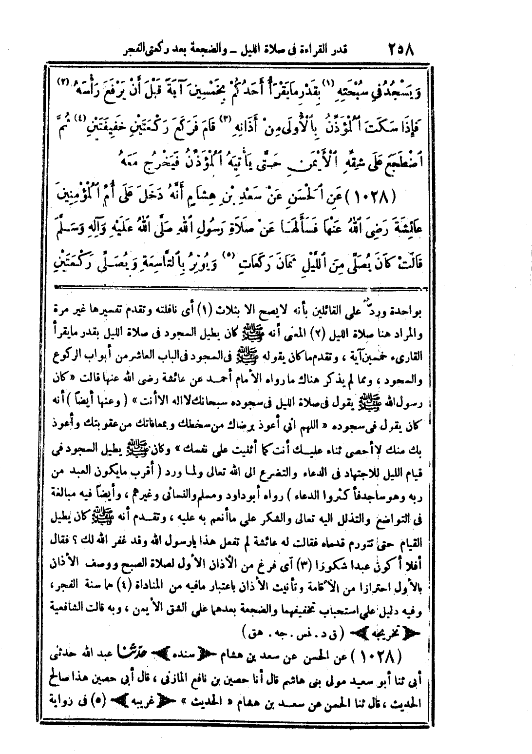 (1028) عن الحسن عن سعد بن هشام أنه دخل على أم المؤمنين عائشة رضى الله عنها فسألها عن صلاة رسول الله صلى الله عليه وآله وسلم قالت كان يصلى من الليل ثمان ركعات (5) ويوتر بالتاسعة ويصلي ركعتين