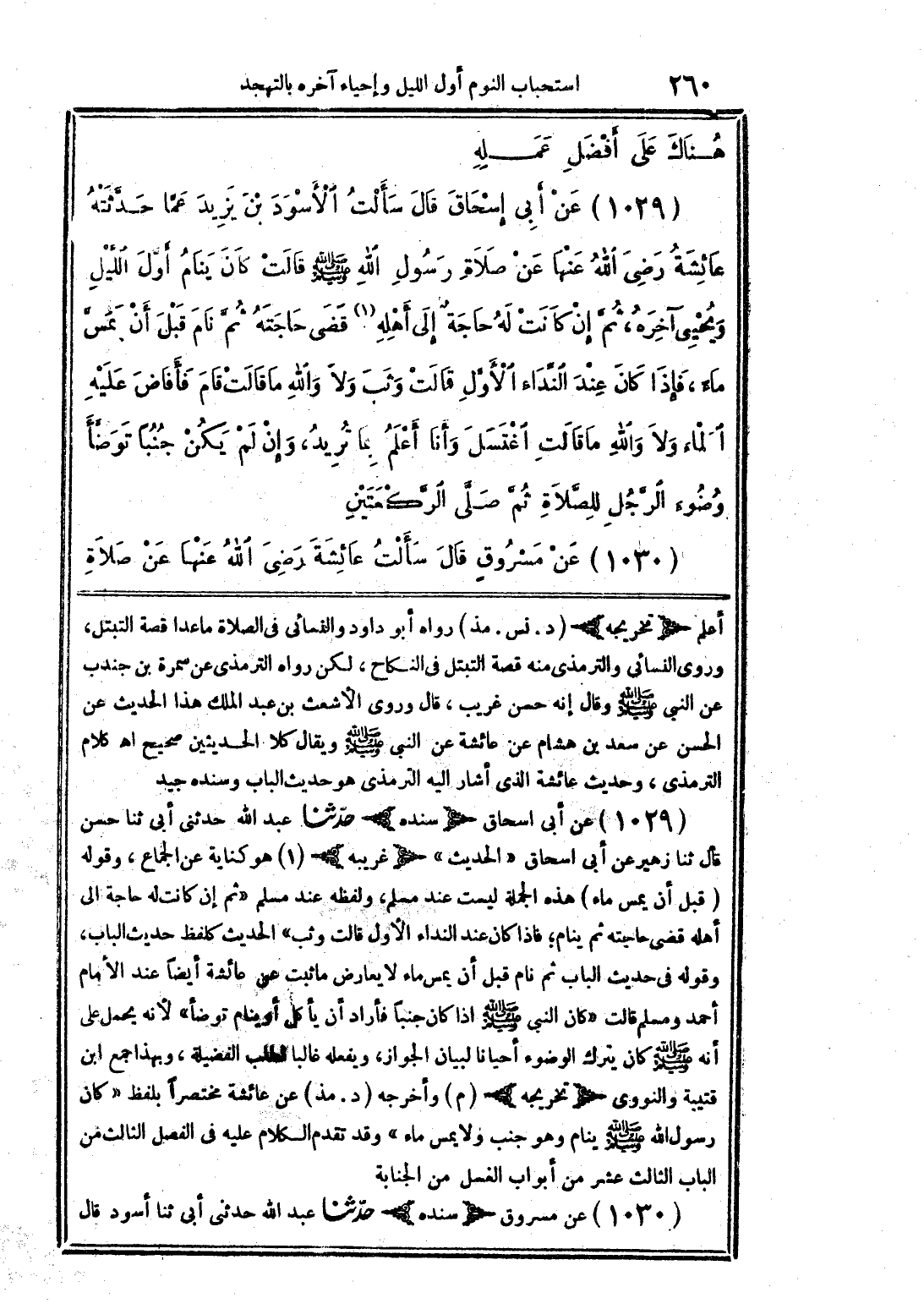 (1029) عن أبي إسحاق قال سألت الأسود بن يزيد عما حدثته عائشة رضى الله عنها عن صلاة رسول الله صلى الله عليه وسلم قالت كان ينام أول الليل ويحيى آخره، ثم إن كانت له حاجةٌ إلى أهله (1) قضى حاجته ثم نام قبل أن يمس ماء، فإذا كان عند النداء الأول قالت وثب ولا والله ما قامت قام فأفاض عليه الماء ولا والله ما قالت اغتسل وأنا أعلم بما تريد، وإن لم يكن جُنُبًا توضأ وضوء الرجل للصلاة ثم صلى الركعتين