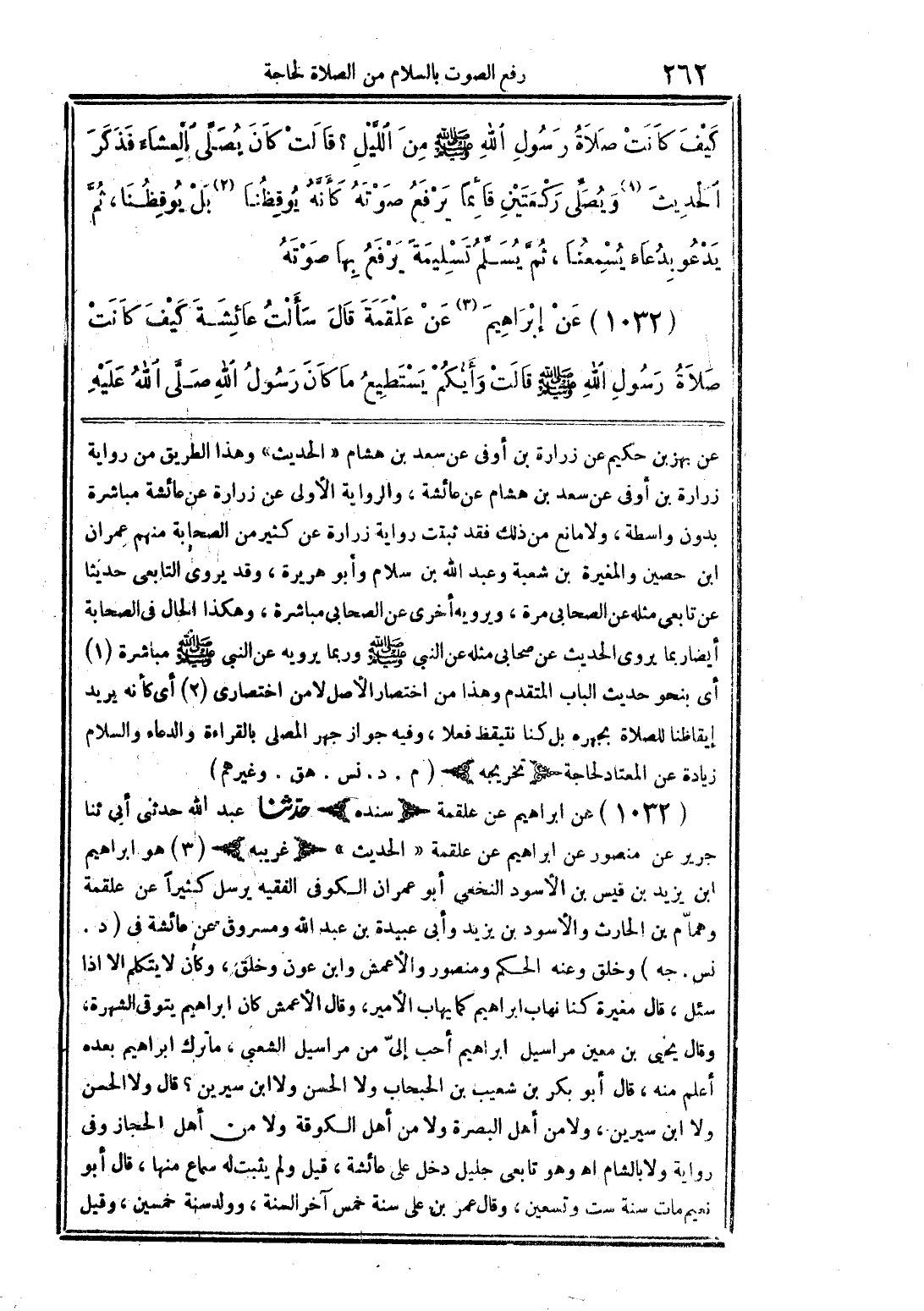 عن بهز بن حكيم عن زراية بن أوفى عن سعد بن هشام "الحديث" وهذا الطريق من رواية زرارة بن أوفى عن سعد بن هشام عن عائشة، والرواية الأولى عن زراية عن عائشة مباشرة بدون واسطة، ولا مانع من ذلك فقد ثبت رواية زرارة عن كثير من الصحابة منهم عمران بن حصين والمغيرة بن شعبة وعبد الله بن سلام وأبو هريرة، وقد يروي التابعي حديثًا عن تابعي مثله عن الصحابي مرة، ويرويه أخرى عن الصحابي مباشرة، وهكذا الحال في الصحابة أيضًا ربما يروي الحديث عن صحابي مثله عن النبي صلى الله عليه وسلم وربما يرويه عن النبي صلى الله عليه وسلم مباشرة (1) أي بنحو حديث الباب المتقدم وهذا من اختصار الأصل لا من اختصاري (2) أي كأنه يريد إيقاظنا للصلاة بجهره بل كنا نتيقظ فعلًا، وفيه جواز جهل المصلي بالقراءة والدعاء والسلام زيادة عن المعتاد لحاجة (تخريجه) (م. د. نس. هق. وغيرهم)