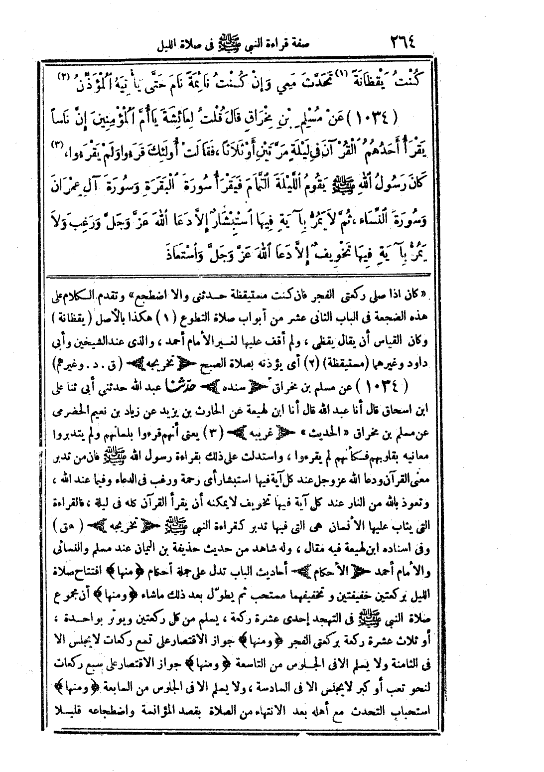 (1034) عن مسلم بن مخراقٍ قال قلت لعائشة يا أم المؤمنين إن ناسًا يقرأ أحدهم القرآن في ليلةٍ مرتين أو ثلاثًا، فقالت أولئك قرءوا ولم يقرءوا (3)، كان رسول الله صلى الله عليه وسلم يقوم الليلة التمام فيقرأ سورة البقرة وسورة آل عمران وسورة النساء، ثم لا يمر بآيةٍ فيها استبشارٌ إلا دعا الله عز وجل ورغب ولا يمر بآيةٍ فيها تخويفٌ إلا دعا الله عز وجل واستعاذ