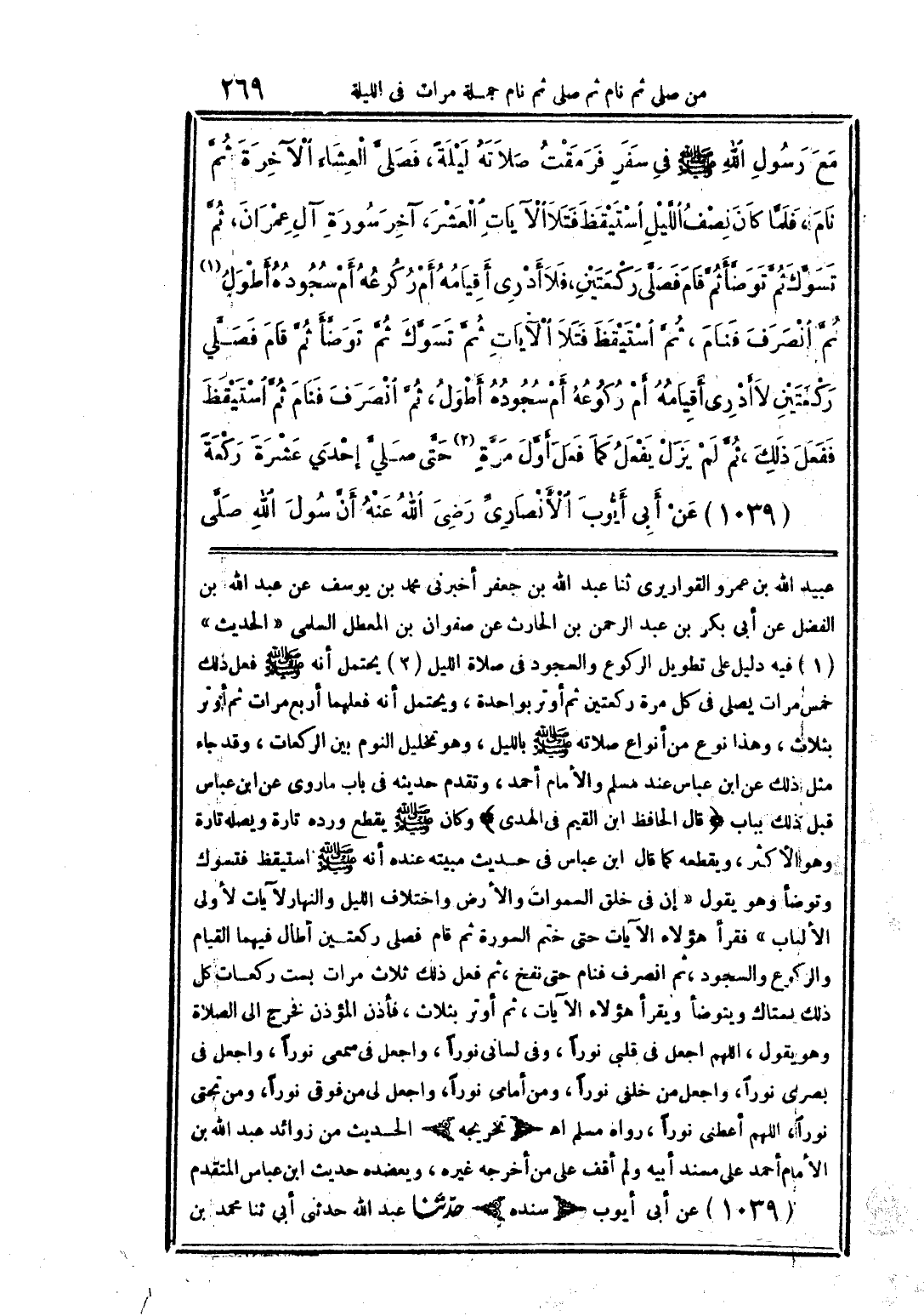 عبيد الله بن عمرو القواريري ثنا عبد الله بن جعفر أخبرني محمد يوسف عن عبد الله بن الفضل عن أبي بكر بن عبد الرحمن بن الحارث عن صفوان بن المعطل السلمي "الحديث" (1) فيه دليل على تطويل الركوع والسجود في صلاة الليل (2) يحتمل أنه صلى الله عليه وسلم فعل ذلك خمس مرات يصلي في كل مرة ركعتين ثم أوتر بواحدة، ويحتمل أنه فعلهما أربع مرات ثم أوتر بثلاث، وهذا نوع من أنواع صلاته صلى الله عليه وسلم بالليل، وهو تخليل النوم بين الركعات، وقد جاء مثل ذلك عن ابن عباس عند مسلم والإمام أحمد، وتقدم حديثه في باب ما روي عن ابن عباس قبل ذلك بباب (قال الحافظ بن القيم في الهدي) وكان صلى الله عليه وسلم يقطع ورده تارة ويصله تارة وهو الأكثر، ويقطعه كما قال ابن عباس في حديث مبيته عنده أنه صلى الله عليه وسلم استيقظ فتسوك وتوضأ وهو يقول "إن في خلق السموات والأرض واختلاف الليل والنهار لآيات لأولي الألباب" فقرأ هؤلاء الآيات حتى ختم السورة ثم قام فصلى ركعتين أطال فيهما القيام والركوع والسجود، ثم انصرف فنام حتى نفخ، ثم فعل ذلك ثلاث مرات بست ركعات كل ذلك يستاك ويتوضأ ويقرأ هؤلاء الآيات، ثم أوتر بثلاث، فأذن المؤذن فخرج إلى الصلاة وهو يقول، اللهم اجعل في قلبي نورًا، وفي لساني نورًا، واجعل في سمعي نورًا، واجعل في بصري نورًا، واجعل من خلفي نورًا، ومن أمامي نورًا، واجعل لي من فوقي نورًا، ومن تحتي نورًا، اللهم اعطني نورًا، رواه مسلم اهـ (تخريجه) الحديث من زوائد عبد الله بن الإمام أحمد على مسند أبيه ولم أقف على من أخرجه غيره، ويعضده حديث ابن عباس المتقدم