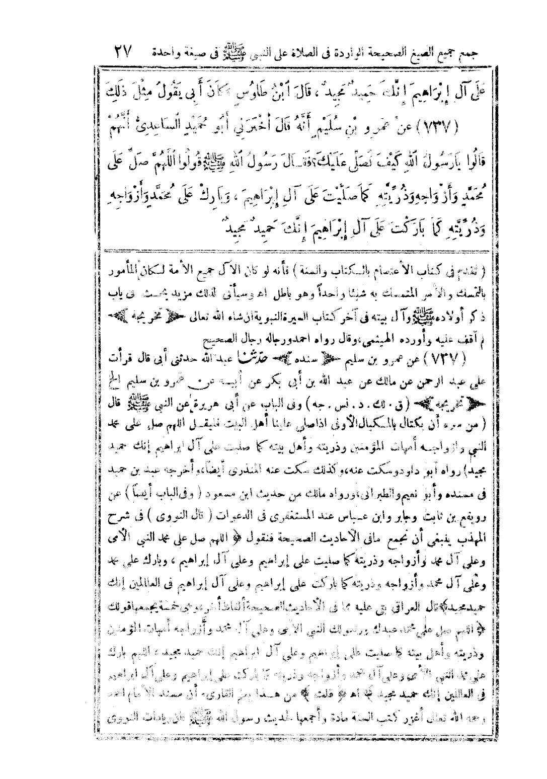 (تقدم في كتاب الاعتصام بالكتاب والسنة) فإنه لو كان الآل جميع الأمة لكان المأمور بالتمسك والأمر المتمسك به شيئًا واحدًا وهو باطل. اهـ. وسيأتي لذلك ميزد بحث في باب ذكر أولاده صلى الله عليه وسلم وآل بيته في آخر كتاب السيرة النبوية إن شاء الله تعالى. (تخريجه) لم أقف عليه، وأورده الهيثمي وقال: رواه أحمد ورجاله رجال الصحيح. 737 - عن عمرو بن سليم (سنده) حدثنا عبد الله حدثني أبي قال: قرأت على عبد الرحمن عن مالك عن عبد الله بن أبي بكر عن أبيه عن عمرو بن سليم الخ. (تخريجه) (ق. لك. د. نس. جه) وفي الباب عن أبي هريرة عن النبي صلى الله عليه وسلم قال: «من سره أن يكتال بالمكيال الأوفى إذا صل علينا أهل البيت فليقل: اللهم صل على محمد النبي وأزواجه أمهات المؤمنين وذريته وأهل بيته كما صليت على آل إبراهيم إنك حميد مجيد» رواه أبو داود وسكت عنه، وكذلك سكت عنه المنذري أيضًا، وأخرجه عبد بن حميد في مسنده وأبو نعيم والطبراني، ورواه مالك من حديث ابن مسعود. وفي الباب أيضًا عن رويفع بن ثابت وجابر وابن عباس عند المستغفري في الدعوات. قال النووي في (شرح المهذب): ينبغي أن نجمع ما في الأحاديث الصحيحة فنقول: «اللهم صل على محمد النبي الأمي وعلى آل محمد وأزواجه وذريته كما باركت على إبراهيم وعلى آل إبراهيم في العالمين إنك حميد مجيد». قال العراقي: بقي عليه مما في الأحاديث الصحيحة ألفاظ أخر، وهي خمسة يجمعها قولك «اللهم صل على محمد عبدك ورسولك النبي الأمي وعلى آل محمد وأزواجه أمهات المؤمنين وذريته وأهل بيته كما صليت على إبراهيم وعلى آل إبراهيم إنك حميد مجيد، اللهم بارك على محمد النبي الأمي وعلى آل محمد وأزواجه وذريته كما باركت على إبراهيم وعلى آل إبراهيم في العالمين إنك حميد مجيد» اهـ. قلت: من هذا يعلم القارئ أن مسند الإمام أحمد رحمه الله تعالى أغزر كتب السنة مادة وأجمعها لحديث رسول الله صلى الله عليه وسلم، فإن زيادات النووي