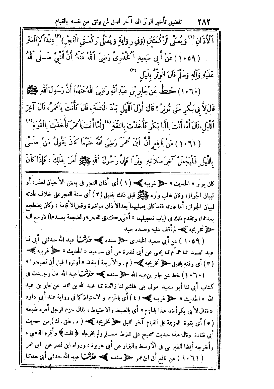 (1060) خط عن جابر بن عبد الله رضي الله عنهما أن رسول الله صلى الله عليه وعلى آله وصحبه وسلم قال لأبي بكر متى توتر؟ قال أول الليل بعد العتمة، قال فأنت يا عمر، قال آخر الليل، قال أما أنت يا أبا بكر فأخذت بالثقة (4) وأما أنت يا عمر فأخذت بالقوة (5).