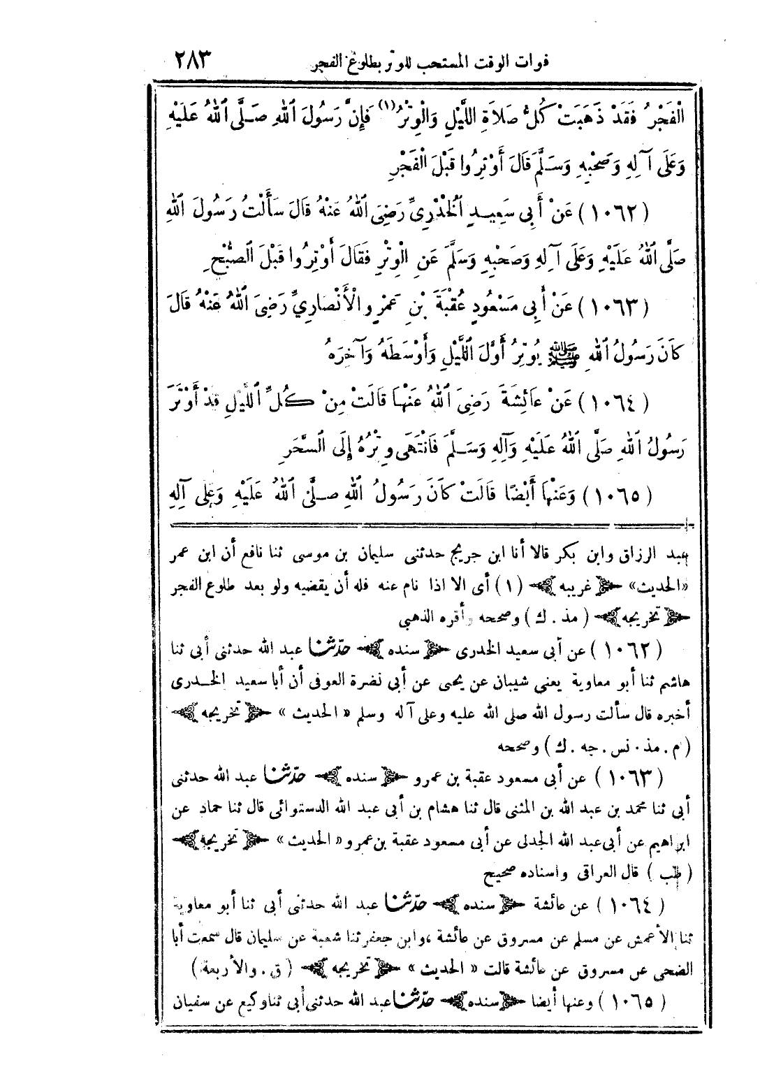 عبد الرزاق وابن بكر قالا أنا ابن جريح حدثني سليمان بن موسى ثنا نافع أن ابن عمر (الحديث) (غريب) (1) أي إلا إذا نام عنه فله أن يقضيه ولو بعد طلوع الفجر (تخريجه) (مذ. ك) وصححه وأقره الذهبي.