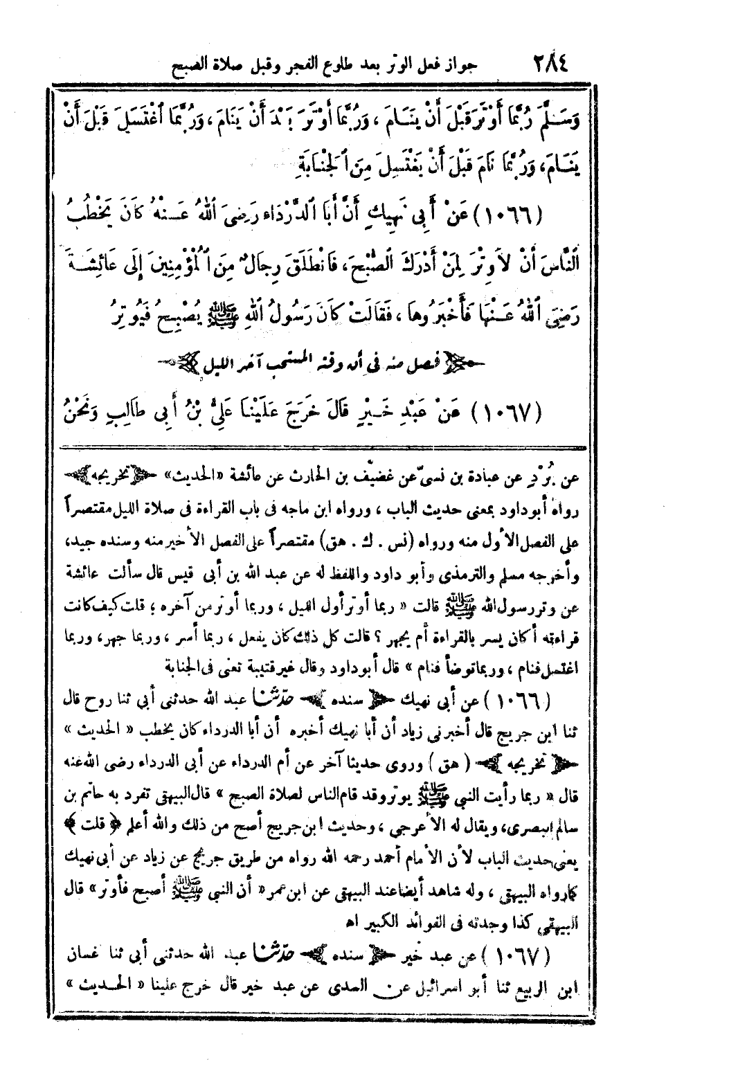 (1066) عن أبي نهيك أن أبا الدرداء رضي الله عنه كان يخطب الناس أن لا وتر لمن أدرك الصبح، فنطلق رجال من المؤمنين إلى عائشة رضي الله عنها فأخبروها، فقالت كان رسول الله صلى الله عليه وسلم يصبح فيوتر.